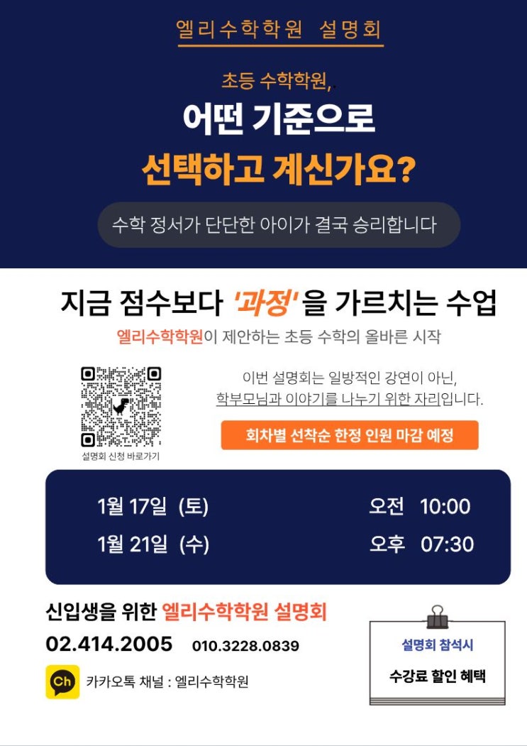 안녕하세요, 엘리수학학원입니다. 새 학년을 앞두고 우리 아이 수학 교육에 고민이 많으실 시기입니다. 집 근처에 수많은 학원이 있지만, 막상 상담을 가보려니 "정말 우리 아이에게 맞는 곳일까?", "단순히 진도만 빨리 나가는 건 아닐까?" 하는 걱정이 앞서실 텐데요. 엘리수학학원에서 그 고민에 대한 명쾌한 답을 드리고자 신입생 학부모 설명회를 개최합니다. "수학 정서가 단단한 아이가 결국 승리합니다" 많은 분이 '수학' 하면 높은 점수와 빠른 선행을 먼저 떠올립니다. 하지만 엘리수학은 조금 다른 이야기를 하려 합니다. 점수보다 '과정'을 가르치는 수업: 당장의 시험....... <img src="https://blogthumb.pstatic.net/MjAyNjAxMDdfODUg/MDAxNzY3NzQ1MzkyMjIw.xWg7ARZ5hfEruyvHzoYPhpecYLMryM4Vr6baraKUUEUg.TO2NtMc2xMOK_tlfDARm-kCWuPR0ABfYShLVNe2MHh8g.JPEG/%BC%B3%B8%ED%C8%B8QR%C3%DF%B0%A1.jpg?type=s3" />
