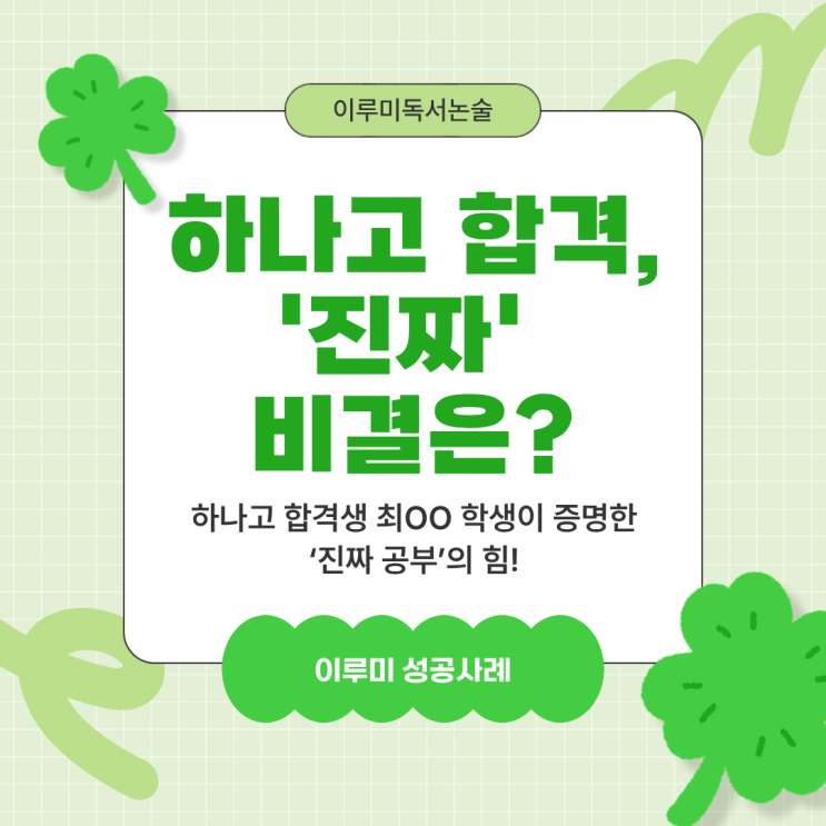 .안녕하세요, 아이들의 가능성을 발견하고 꿈을 실현하도록 돕는 이루미독서논술입니다. 입시 환경이 아무리 변해도 변하지 않는 사실이 하나 있습니다. 바로 자기주도 학습 능력의 정점에 있는 아이들이 목표하는 학교에 합격한다는 점입니다. 특히 자립형 사립고의 대명사인 하나고등학교는 단순히 성적이 좋은 아이가 아니라, 스스로 생각하고 논리적으로 문제를 해결할 줄 아는 아이를 원합니다. 오늘은 저희 이루미에서 꾸준히 실력을 쌓아 당당히 하나고 합격이라는 결실을 본 최OO 학생의 이야기를 전해드리려 합니다. 막연한 문제풀이가 아닌, 깊이 있는 읽기로 다져진 내공 최OO 학생은 이루미독서논술과 함께하며 '제대로 읽고 쓰....... <img src="https://blogthumb.pstatic.net/MjAyNjAxMTNfMjY4/MDAxNzY4Mjg4MjY5ODQ4.UMlRDPaFfDO9h2a22fTphQgFsid9hoy_uoZP1aILM64g.hdkiK5Q6wZMesiEAXzHVT5RRFLDmdjPpdNXXISTw7Sog.PNG/1.png?type=s3" />