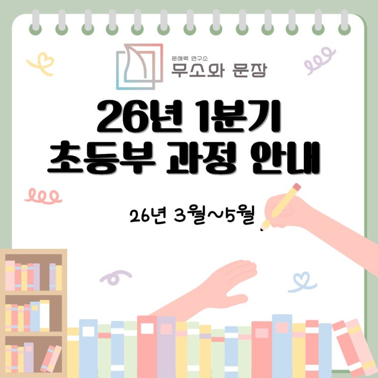 안녕하세요! "언어 영재로 키웁니다" 문해력 연구소! 위례 독서논술학원 무소와 문장입니다. 오늘은 26년 1분기(3-5월) 초등부 수업에 대해 안내드리려고 합니다. 글보다 그림이 선행하는 특정 발달 시기에는 그림책을 통해 다층적인 언어를 이해하게 됩니다. 문학과 미술을 결합하여 독특한 문법을 표현하는 그림책은 통합적인 사고를 이끄는 가장 훌륭한 매개체입니다. 창의적 사고를 제한하는 일반적인 그림책 독해를 벗어나, 그림책의 글과 그림을 연결하여 얻은 여러 아이디어를 결합하며 통합적 사고를 경험합니다. 획득한 아이디어를 다양한 매체로 구현하는, 역동적인 수업을 통해 창의적 사고를 길러갑니다. 어휘는 생각을 만....... <img src="https://blogthumb.pstatic.net/MjAyNjAxMTRfMTE0/MDAxNzY4Mzc4OTI3MzUz.4LGwPT7wrUaWi2P4FaIL4n1lwxEtV16ArMa6d3S821Qg.swiVdUUzPrtQgRe3yXD6gRZz3PO2asxcrHt7sbv8OEwg.JPEG/1.jpg?type=s3" />