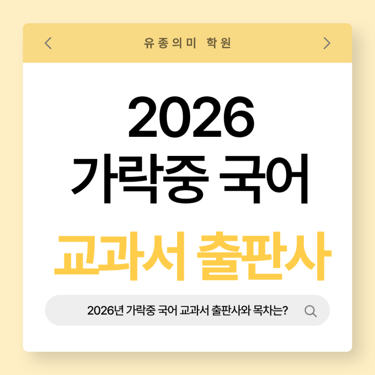 안녕하세요:) 유종의미 학원 중등부 국어 강사 오선화입니다. 오늘은 2026년 가락중 국어 교과서 출판사와 1학기 목차에 대해서 안내드립니다! 2025년부터 2022개정 교육과정이 전면 도입되어 새로운 교과서로 학생들이 학습하고 있습니다! 이에 따라 1,2학년은 2022개정 교육과정 교과서, 3학년은 2015개정 교육과정 교과서로 학습을 진행합니다! ✔ 1학년 — 천재교육(노미숙) 2025년과 다르게 천재(노미숙) 교과서를 사용합니다. 작년에는 미래엔(신유식) 교과서를 사용했는데, 2026년에는 천재(노미숙) 교과서를 사용합니다! 미래엔(신유식)의 경우 품사를 1학기 책에 있어서 1학기 때 배우고, 2학기 때 복습해주고 1차 지필 때 품사를 시험....... <img src="https://blogthumb.pstatic.net/MjAyNjAxMTJfMTkg/MDAxNzY4MjE0Mzk0MDI1.GhAt3MB5I5e_HCIyREU2VPFiMbh_hYW4KrZIZgN64wkg.1VURuD4yx3CFC0_iPaS8xD3sAclJrWamvRhT1zsjK7Ig.PNG/KakaoTalk_Photo_2026-01-12-19-39-31_001.png?type=s3" />