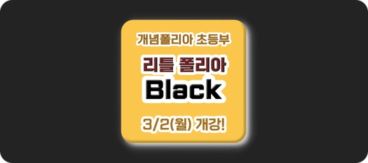 안녕하세요, 개념폴리아 잠실관 초등부입니다. 2026년 3월 신규반! 리틀폴리아 "Black" 반을 개강합니다. 리틀폴리아 블랙반이란? 초등5-1 심화를 완벽하게 마스터한 초등 3학년 학생들만을 위한 과정반입니다. 초등학교 3학년 단 1년만에 중학교 1학년 1학기 수학까지 완성하는 프로그램입니다. 커리큘럼 화목 3:30~6:40 (주2회반) 3개월 과정으로 기본부터 심화까지 완벽하게 마스터하여 중등과정의 기초를 탄탄하게 다집니다. 왜 "블랙반" 이어야 할까? 1. 골든 타임을 잡는다 초등 3학년부터 수학 격차가 벌어지는 시기입니다. 이 시기 제대로 몰입 학습을 진행하여 고등학교 입학 전 고등 수학을 준비할 수 있습니다. 2....... <img src="https://blogthumb.pstatic.net/MjAyNjAxMTJfOTgg/MDAxNzY4MjAxMDgwODU4.DLfLBS5R4jAoehdb_xfUnJ1aOcjT_3FePA7_lxAZyRQg.v3egC4-KB-2D87vx_kk8Vy-iaPcJt06b1iBRY4STKhUg.JPEG/2026_01%BF%F9_%B8%AE%C6%B2%C6%FA%B8%AE%BE%C6_%BA%ED%B7%A2.jpg?type=s3" />