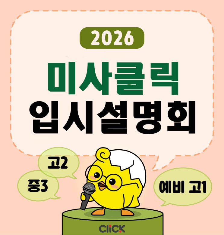 미사 미술학원 하남 미술학원 미사 클릭미술학원! 송파 클릭과 미사 클릭은 같은 학원입니다! 안녕하세요~^^ 미사 클릭미술학원 입니다. 2026년 미사 클릭미술학원 입시설명회를 개최합니다! 2026년도를 맞이하여, 앞으로 새학기를 어떻게 준비하면 좋을지, 또는 2026년부터 미대입시를 시작하려고 하는데 뭐부터 시작하면 좋을지 난감한 중고등학생들과 학부모님들을 위해서 입시설명회를 준비했습니다!!! 2026년 1월 11일(일) 오후 2시에 진행합니다. 미대 입시 설명회는 약 3시간 정도 걸리며, 상황에 따라 끝나는 시간이 조금 달라질 수 있습니다. 장소는 미사미술학원 '클릭'미술학원에서 진행합니다. 찾아오시는 길이 어려우시다....... <img src="https://blogthumb.pstatic.net/MjAyNjAxMDRfMTE3/MDAxNzY3NDg4NTg5MTY5.j_f5YsOzoIKQQdQQ_AVqhBrJ5BPX6oYKtDWfgs_g1WMg.kJxbZwm6cwTo_N8AY_NbruLs122mHfSynofl9ECAzP8g.JPEG/3%C2%F7_%C0%D4%BD%C3%BC%B3%B8%ED%C8%B8-01_%281%29_%BA%B9%BB%E7.jpg?type=s3" />