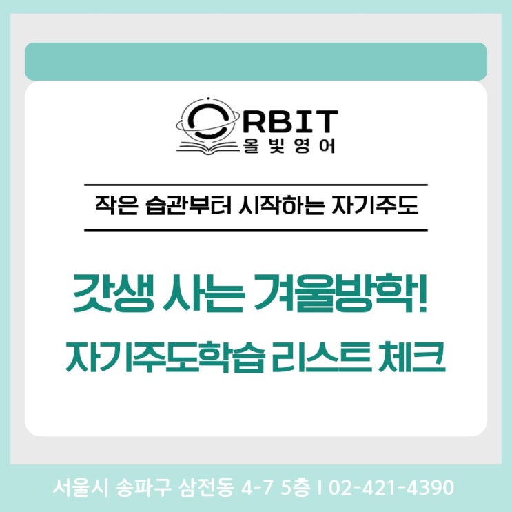 안녕하세요! 잠실학원사거리 중고등 영어전문 올빛영어입니다! 안녕하세요! 추운 겨울바람과 함께 겨울방학이 찾아왔습니다. ❄ 방학은 학교 수업이라는 정해진 틀에서 벗어나, 온전히 나만의 공부 시간을 확보할 수 있는 절호의 기회입니다. 하지만 혼자 공부하는 것이 익숙하지 않은 학생들에게는 오히려 막막한 시간이 될 수도 있죠. 오늘은 이번 겨울방학을 알차게 보낼 수 있는 자기주도학습 핵심 가이드를 정리해 드립니다! '양'보다 '질', 실천 가능한 계획 세우기 많은 학생이 방학 첫날, 문제집 대여섯 권을 끝내겠다는 무리한 계획을 세웁니다. 하지만 1월 중 열흘이 훌쩍 지난 이 시점, 미뤄 온 material 들이 계....... <img src="https://blogthumb.pstatic.net/MjAyNjAxMTJfMTc3/MDAxNzY4MjAzNzQ0Mjg1.PCxaqQJMocxgNlOwyxWlO8Q2y8ex6FcJwGYP4H0h8oMg.1hvK2KQtLxbE_NsdxBamn5VaH0hxgiL8QTrxysb0LvYg.JPEG/%C1%A6%B8%F1%C0%BB_%C0%D4%B7%C2%C7%D8%C1%D6%BC%BC%BF%E4._%287%29.jpg?type=s3" />