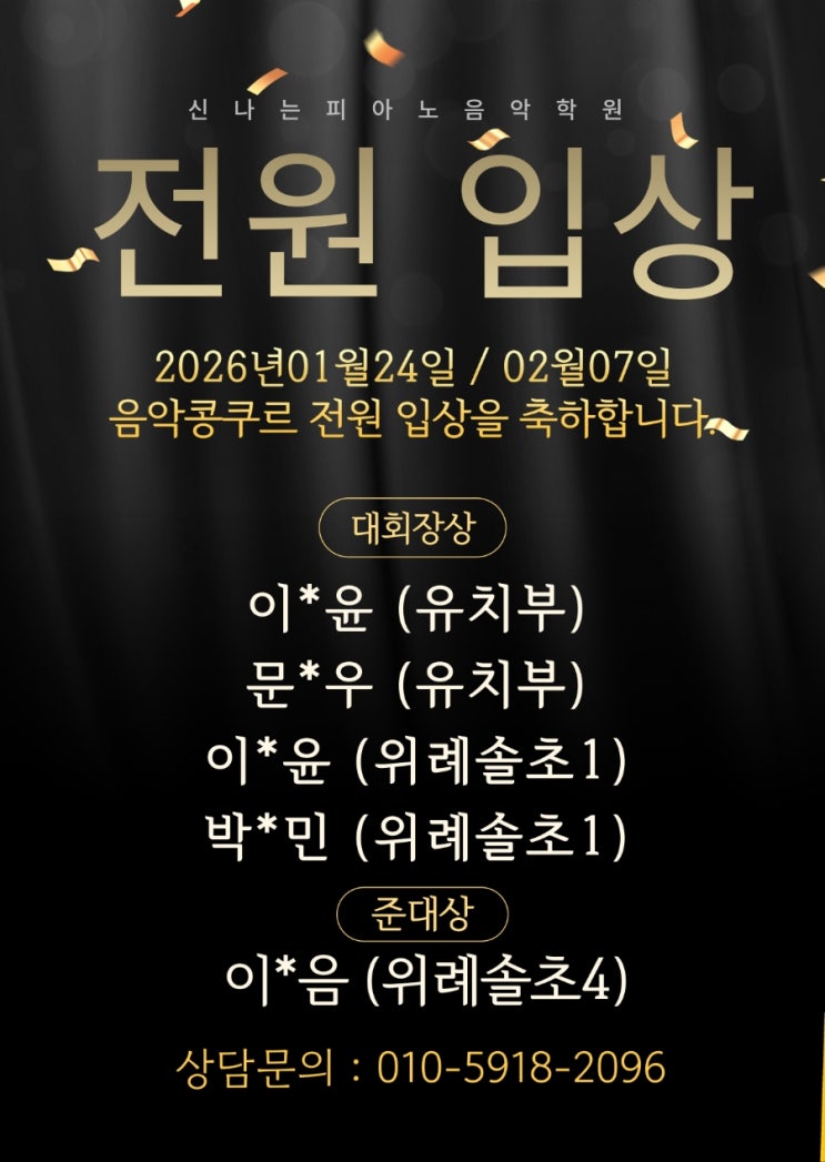북위례피아노학원 ✨️신나는피아노음악학원✨️ - 신나는 콩쿨 2026년 1월24일 2026년 2월 7일 새해가 되자마자 콩쿨에 참가한 신나는피아노 친구들을 응원해요. 열심히 연습하더니 전원 입상하는 멋진 신피친구들입니다. 신나는피아노는 연 3회 이상 콩쿨에 참가하고 외부 정기연주회와 원내 연주회를 계획하고 있습니다. 3월 등록 대기가 많은 신피입니다. 곧 3월 등록 대기 명단도 마감될 것 같아요. 늘 감사드립니다. 신나는피아노에서 신나는 음악교육을 경험시켜주세요. 신나는피아노는 우성어반타워10층에 있습니다. 010-5918-2096 등록번호제8052호 #북위례 #우성어반타워 #북위례맘 #송파레이크파크호반써밋2차 #위례솔초....... <img src="https://blogthumb.pstatic.net/MjAyNjAyMDlfMjkx/MDAxNzcwNjE0NjMwMTYz.3dyr6OHA76tBfRaIE9Czq94C0v8I6DTw3zIxznYiE3Qg.ssizi1lCZ_gwMmlgMNETdXzivL9p0xne9CGN6MwEj1Mg.JPEG/900%A3%DF1770614563416.jpg?type=s3" />