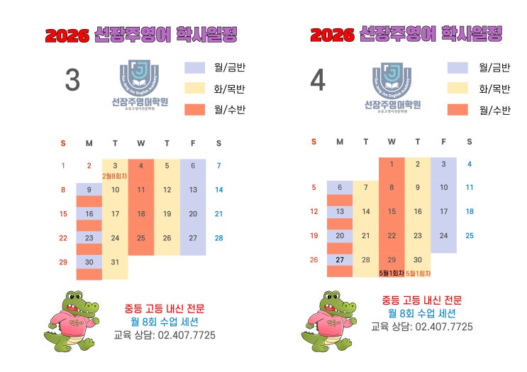 [위례 영어 학원] 선장주영어학원 2026년 3월,4월 정규반 학사일정 & 잉글리시 프렌즈 학사일정