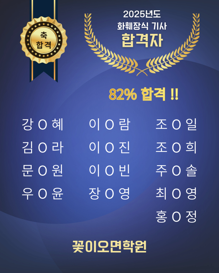 ❤️ 12월 24일 성탄절을 하루 앞 두고 꽃이오면학원에 기쁜 소식이 들려왔어요. 기사시험에 응시 하셨던 수강생분들의 합격 소식~ 이번 기사시험에서 꽃이오면학원 수강생분들의 합격률은 82%!! 그리고 합격하신 분들의 점수도 고득점으로 기분 좋은 소식을 전해주셨습니다. 다시 한번 화훼장식기사 최종합격을 진심으로 축하 드립니다. 이제 여러분들의 꽃과 함께하는 인생에 더욱 큰 행복과 좋은 소식들만 가득 하시길 바랍니다~ 꽃이오면학원 수강문의 인스타그램 ID : omf_school ☎️ 02-704-8641 (학원 대표 전화) 010-8961-3318 (행정 담당 직통 휴대전화) 카카오톡 ID : omf 네이버 블로그 : 꽃이오면학원 오시는 길 서울....... <img src="https://blogthumb.pstatic.net/MjAyNTEyMjRfMjU4/MDAxNzY2NTgxMDQ5ODkx.uWb41mVeNAIjmclN1BBFFsTtUfmXCn8eoPaNEQlJi5Ag.PSPEsKS-Zb2DvkPM_wm4lIyl1P0D9aoZxWsOHrj5nAYg.PNG/%BA%ED%B7%E7_%B0%F1%B5%E5_%B8%F0%B4%F8%C7%D1_%B4%EB%C7%D0_%C0%D4%BD%C3_%C3%D6%C1%BE%C7%D5%B0%DD%C0%DA_%B8%ED%B4%DC_%C7%D0%BF%F8_%C8%AB%BA%B8_%C6%F7%BD%BA%C5%CD_%28%C0%CE%BD%BA%C5%B8%B1%D7%B7%A5_%B0%D4%BD%C3%B9%B0%2845%29%29_%284%29.png?type=s3" />