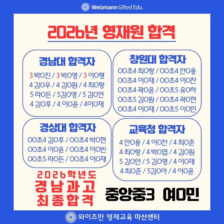초등 상위권 아이들 둔 부모님들은 한 번쯤은 이런 고민 하시죠? "영재원은 꼭 필요한가?" "교육청, 대학부설은 뭐가 다른거지?" 최근 수학 과학 융합 중심의 교육과정이 확대되면서 단순한 성적보다 탐구,논리,창의력이 더욱 중요해졌습니다 이때 영재교육원은 핵심 역량을 키울 수 있는 출발점이 됩니다 마산 와이즈만 2026년 영재원 결과가 발표 되었습니다 올해도 좋은 소식 들려드리게 되었습니다 특히나 3학년들이 도전해서 좋은 경험과 결과를 얻을 수 있어서 기쁘네요 대학부설 영재원, 교육청 영재원 합격한 친구들 모두 축하하고 좋은 경험 되기를 바랍니다 영재교육원은 크게 "교육청 영재교육원" 과 &....... <img src="https://blogthumb.pstatic.net/MjAyNTEyMzFfMjg4/MDAxNzY3MTY2MTkwODk5.6UkF3FVAwSpuBQ-F6Qg82IQeP04gzCxKcktgoUXUDCAg.mZMxUkem92qzuqFOJJ1RMz0YavkRqaknFCdAMq4QDCkg.PNG/KakaoTalk_20251231_144441061_01_%282%29.png?type=s3" />