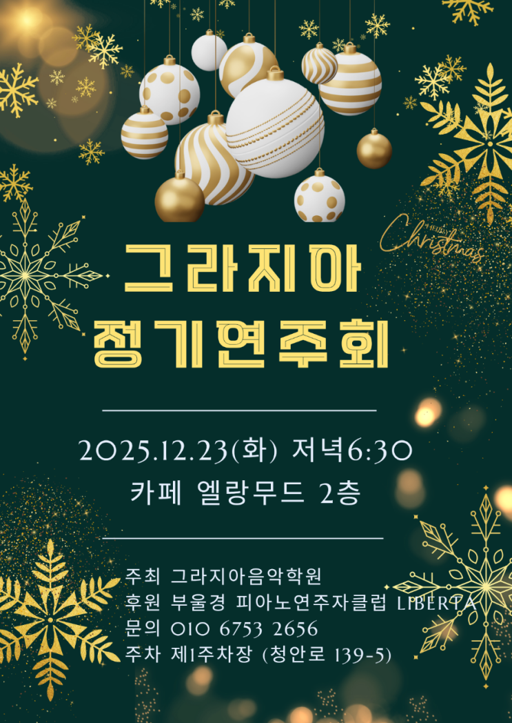 크리스마스와 연말을 맞아 한해를 돌아보며 감사와 사랑을 연주회로 준비한 그라지아 피아니스트들♡ 매달 향상음악회를 통해 쌓아온 레파토리들과 캐롤곡을 연주곡으로 만들어 보았어요♡ 무대를 두려워했던 눈빛과 떨리는 손들은 어디로가고 정말 곡에 심취해 표현잘해내며 멋진 무대매너까지♡ 최고최고였던 우리 그라지아 피아니스트들♡ 참여 안했으면 후회할뻔 했다는 부모님들까지의 호응도 대단했다는!! 하루하루 성장해가는 우리들^^ 사랑해 우리 아가들 우리 그라지아 친구들 ~ 세상에서 가장 빛나는 피아니스트들이야~~ 즐겁게! 그리고 정확히 배우는 그라지아 음악학원 창원시 진해구 안청북로 33 신협2층 (안골포 초등학교 앞....... <img src="https://blogthumb.pstatic.net/MjAyNTEyMjVfNjIg/MDAxNzY2NjU2Mjc4Nzg1.Mhwsdj8y-gvo1bYy8QJfHIGprv-pB9MMHQl-Qk8H8o0g.okMwfKmAQ3EuCCSbBAsFkDTu9cglj3c_71Ajk8XnPt8g.PNG/900%A3%DF%B1%D7%B6%F3%C1%F6%BE%C6_%BF%AC%C1%D6%C8%B8%A3%DF20251214%A3%DF221549%A3%DF0000.png?type=s3" />
