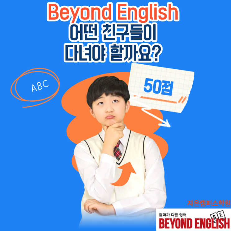 안녕하세요 결과가 다른 영어 학원 비욘드잉글리쉬 자은캠퍼스학원입니다. 비욘드잉글리쉬는 어떤 친구들이 다녀야 할까요? 1. 영어를 처음 배우는 친구들 2. 영어로 읽고 듣고 말하고 쓰기가 어려운 친구들 3. 학습 위주의 영어 공부가 싫고 언어로 영어를 쓸 수 없는 친구들 4. 영어를 오랫동안 했는데 결과가 없는 친구들 5. 파닉스는 다 배웠지만 영어 단어를 잘 못 읽는 친구들 ▼ ▼ ▼ ▼ 비욘드잉글리쉬에서는 아래와 같은 방법으로 영어를 해결해 드립니다. 1. 영어를 처음 배우는 친구들에게는 언어의 순서에 맞게끔 처음부터 차곡차곡 영어를 마스터 할 때까지 비욘드잉글리쉬에서 책임을 집니다 어떻게? 특허받은 교재와 교구로 미국....... <img src="https://blogthumb.pstatic.net/MjAyNjAxMTNfMTgw/MDAxNzY4MzE2MDU1MDg1.arCAbVPwMUaRgP1bnyYC8MDpsyo8-xtsEJp-zZTqxCYg.a0UUOAzruYCScE6xi8Z-BId_8cAnslryN5gBmbwETdUg.PNG/%C1%A6%B8%F1%C0%BB_%C0%D4%B7%C2%C7%D8%C1%D6%BC%BC%BF%E4._%287%29.png?type=s3" />