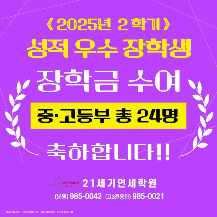✨ 2025년 2학기 성적 우수 장학생 발표 ✨ 우리 21세기 연세학원 학생들이 2025년 2학기 내신에서 멋진 성과를 이루어냈습니다! 중·고등부 총 24명의 장학생이 선발되었으며, 우수한 성적에 따라 수강료 장학 혜택을 지급했습니다. 노력한 만큼 빛나는 결과를 만들어낸 우리 학생들 정말 자랑스럽습니다 앞으로도 학생 한 명 한 명의 성장을 위해 더 꼼꼼하고 진심 어린 지도로 함께하겠습니다. 다시 한 번 우리 장학생들 진심으로 축하합니다! <img src="https://blogthumb.pstatic.net/MjAyNjAyMTRfMTM5/MDAxNzcxMDAwMzcyOTA2.yN2s96QzB1ZdkaqAT0B_XkqBuK2cKIcEOtKFhTXzPhkg.N6k3TQhlpd_Od_kgcioRGcAb7vlOWAtd6CDb0bZluBog.JPEG/900%A3%DF1770818200578.jpg?type=s3" />