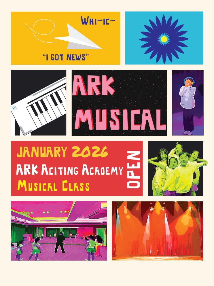 ARK STAGE | 뮤지컬 수업 아이들이 단지 무대에 서는 경험이 아닌, 뮤지컬을 ‘배우며’ 표현하는 시간을 만듭니다. ARK STAGE는 단기간의 보여주기식 수업이 아닌, 매주 차곡차곡 쌓이는 훈련을 통해 노래 · 연기 · 안무를 깊이있게 배우고 작은 무대 안에서 자신을 진심으로 표현해보는 경험을 만들어갑니다. ARK STAGE, 이런 수업입니다 ✔ 3개월 1학기제로 진행 ✔ 주 1회 120분 수업 ✔ 1·2학기 모두 참여 시 정식 공연 무대 1. 통합적 뮤지컬 훈련 : 노래, 안무, 연기를 따로 배우는 것이 아닌, 장면 속 감정과 호흡을 중심으로 실전형 통합 훈련이 이뤄집니다. 무대 위에서 ‘내가 누구인지’ 말할 수 있도록, 표현의 연결을 가....... <img src="https://blogthumb.pstatic.net/MjAyNTEyMjRfMTk5/MDAxNzY2NTE2NjE1NTEz.oW2M2BfATl3iy1reNPRF-H09GXBUQCBzbGaNjDH8xAMg.xpD82TokFjn8wyMpAjWIP1G4wIdGKmgYtTKBa7bUTlMg.PNG/Artboard_1.png?type=s3" />