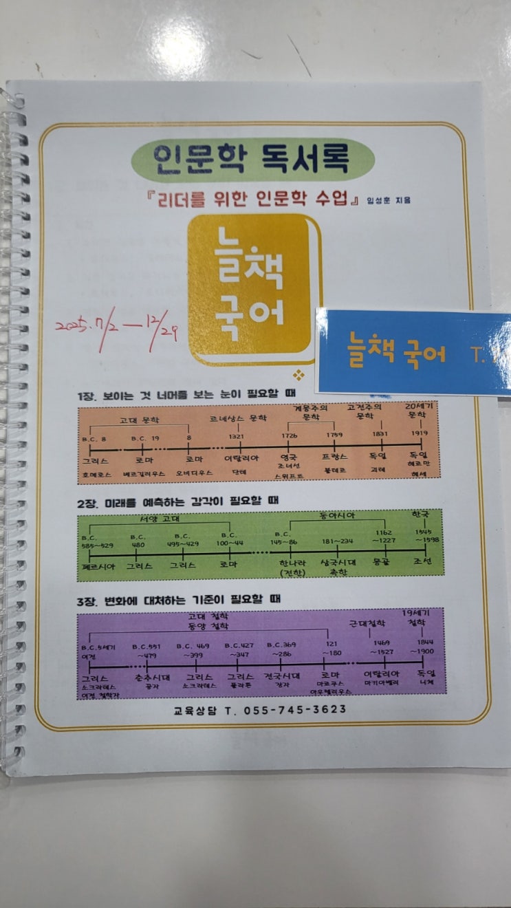 이 책은 늘책 아이들이 [총균쇠]를 읽고나서 시작합니다!! [리더를 위한 인문학 수업]슨 B. C. 8세기부터 19세기에 이르기까지 인문학의 중심 담론이 담긴 책입니다. 중학교 1학년 아이들이 읽고 소화해 내기엔 어려윘을 겁니다. 좋은 책을 고르는 법은 자신의 소양에 맞는 수준의 책을 읽는 것이라고 합니다. 늘책 국어학원은 무조건 어려운 책이 다 좋은 책이 아니라는 점을 항상 염두해 두면서 아이들을 지도합니다. 참고로 국어전문학원인 늘책국어는 수능국어의 방향을 향해 가고 있습니다!!♡(책읽기 지도는 저의 개인적인 욕심 때문입니다;) <img src="https://blogthumb.pstatic.net/MjAyNTEyMjlfMTY3/MDAxNzY3MDA5NDQ1MDUy.YKGZJOf5FWKtdSMvifpHR4ZQsjKqHZ3YjlcMb12plVgg.x0zoXyUy6hcphVpqioOTB1i9GT-KwF5dWls96YXbrQ4g.JPEG/900%A3%DF20251229%A3%DF171633.jpg?type=s3" />