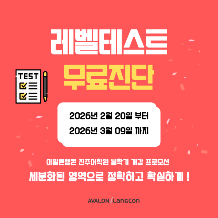 2026 봄학기 등록 프로모션 레벨테스트 무료 진단 이벤트 전문적이고 체계화된 아발론 랭콘 레벨을 통해 우리 아이의 정확한 실력을 파악하고, 올바른 교육방향을 세워주세요. 아발론 랭콘 진주어학원은 학생을 등록 시키기 위해 절대로 거짓말 하지 않습니다. 학생이 어떤 부분이 부족한지, 어떤 부분이 강점인지를 꼼꼼하게 파악한 후 솔직하게 상담해드리겠습니다. 등록하지 않으셔도 됩니다! 우리 아이가 어느 부분에서 힘들어하고 있는지 이번 기회에 제대로 살펴봐주세요. 아발론 랭콘 TEST의 모든 것 / 레벨테스트, A-TEP, Achievement test, Term test 안내 우리 아이들의 영어 실력 과연 어떠한 기준과 준비로 확인하고 점검 해....... <img src="https://blogthumb.pstatic.net/MjAyNjAyMjBfMjA3/MDAxNzcxNTg1MzM1NzY2.pSI7nzpACaYklCL6sxESP1f68JX3Ih-X-PQOoRw41nMg.cn3HvaeTrPY-NX7zpZu-GuE9yFqe7MU1_a79FMsUTGwg.PNG/3.png?type=s3" />