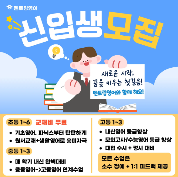 멘토링영어 신입생 모집 : 초등, 중등, 고등 전학년 모집합니다! - 진영 영어 학원 새학기 추천
