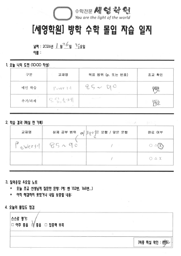 방학 특강으로 진행되는 자기 주도 학습, 이렇게 운영됩니다. 방학은 평소보다 시간 여유가 많아지는 시기인 만큼 [ 얼마나 스스로 공부하는 힘을 기르느냐 ] 가 정말 중요해집니다. * 매일 작성하는 자습 일지, 학습의 시작 자기 주도 학습의 핵심은 '기록'입니다. 학생들은 매일 자습 시간을 마친 후 자습 일지를 직접 작성합니다. 자습 일지에는 오늘 학습할 도전 과제 학습 결과 질의 응답 및 오답 노트 오늘의 몰입도 점검 이렇게 학습 과정 전체를 스스로 돌아볼 수 있는 내용이 담깁니다. 단순히 '공부했다'에서 끝나는 것이 아니라, 어떻게 공부했고 무엇이 부족했는지 스스로 인식하게 됩니다. * 조교 선생님의 확....... <img src="https://blogthumb.pstatic.net/MjAyNjAxMjZfMTM4/MDAxNzY5NDA2MTM3ODc4.whiN0TebbrJMCB6PdnphhdQVKJ70fIGhYIsYhlrKTfYg.tM3PZmECE87qLAbOoICTErHnjr3JY-q-6ORY0n3FljMg.PNG/%BD%BA%C5%A9%B8%B0%BC%A6_2026-01-26_142410.png?type=s3" />