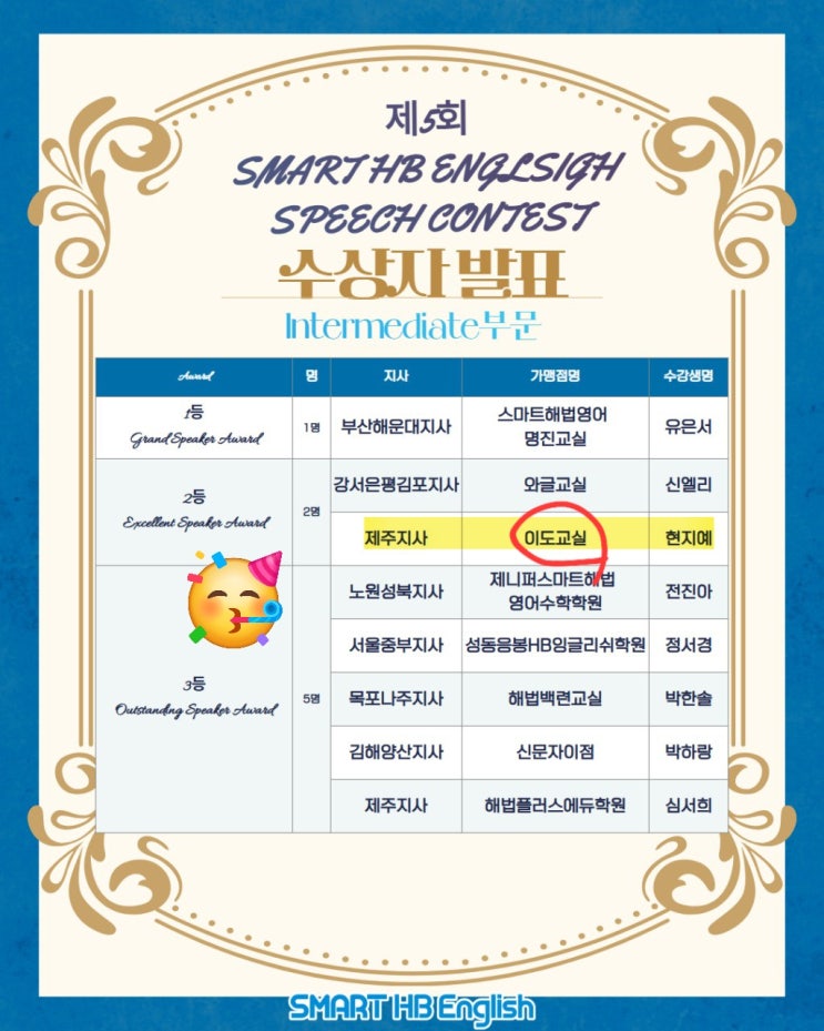 안녕하세요, 스마트해법영어 제주 이도점 원장 브라이언쌤입니다. 오늘 전국의 영어 실력자들이 참가하여 역대급 경쟁률을 기록한 '제5회 스마트해법영어 스피치 콘테스트'의 최종 수상자가 발표되었습니다. ✨ 1차 예선 합격자 2명에 이어 본선의 벽이 매우 높았음에도 불구하고, 저희 스마트해법영어 이도점에서 전국 2등 수상자라는 영광스러운 타이틀을 거머쥐게 되었습니다! 이번 대회를 준비하며 영어에 대한 자신감을 키우고 한 단계 더 성장한 우리 학생들에게 아낌없는 박수를 보냅니다. 아쉽게 순위권에 들지 못했더라도, 끝까지 완주한 모든 해법이들이 이번 경험을 통해 큰 자산력을 얻었으리라 확신합니다. 시....... <img src="https://blogthumb.pstatic.net/MjAyNjAxMzBfMTIy/MDAxNzY5NzY1NTUxNjk3.ifRJIKqo4FiKfYD68M0sTDZumYNAPpGSK2Gk_dCwD0cg.aERhtPeIk-zjdg-Uj2v-bdOuuDwzuv2-SzhMJg_UNCkg.JPEG/KakaoTalk_20260130_173140752.jpg?type=s3" />