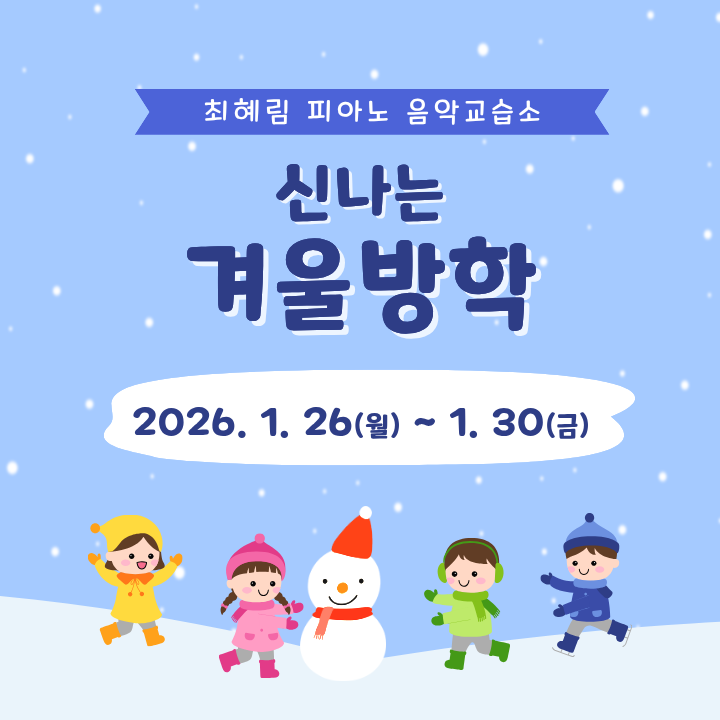 은계지구 은행동에 위치한 최혜림피아노음악교습소의 겨울방학 기간을 안내드립니다. 이번 겨울 방학 기간은 2026년 1월 26일 (월)~ 1월 30일 (금) 까지 입니다. 한 주 잘 쉬고, 2월 2일 (월) 정상등원합니다. 다음 사항들을 잘 숙지하여 우리 친구들 안전하게!! 겨울방학을 보내도록 해요~!! 방학 기간 중 집에서 연습하려고 악보(교재) 챙겨가는 친구들!! 잊지말고 책!! 꼭 가지고 오세요~ 날씨가.. 너무너무 추워요~ 모두들 건강 유의하시길 바라요!! <img src="https://blogthumb.pstatic.net/MjAyNjAxMTlfOTUg/MDAxNzY4ODMzMjExNTI1.7DmtIRzRW-vRhON4toafMbCnU46O7J1r3umdBz9LowQg._m1NyXYlXMsYfKCzaMCpTx5v4IcKoFze0j_bgh2WaRog.PNG/1.png?type=s3" />