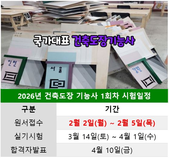 안녕하세요~! "국가대표 건설학원" 입니다. 요즘 건축도장 기능사 자격증 찾으시는 분들이 정말 많더라구요. 성인 학생 할거없이 인기가 많은 자격증입니다. 간단하게 일정 한번 볼까요? 연휴인 설날만 기다리지 말고 원서접수 기간도 기다려야 합니다. 이제 일주일 밖에 남지 않았기 때문에 꼭 잊지말고 접수하세요. 건축도장기능사 시험은 다른 실기시험에 비해서 치수오작의 범위가 엄청 작습니다. "5mm"로 엄청 낮은 치수이라 건축도장 시험은 항상 조심하게 작업을 해야하고 작업순서도 꼭 지켜야합니다. 국가대표건설학원에서는 시험에 중요한 포인트와 불필요한 내용이나 작업 없이 중요한 부분들만 교육을 하기 때문....... <img src="https://blogthumb.pstatic.net/MjAyNjAxMjRfNSAg/MDAxNzY5MjQ0NjYzNDEy.5W-6AfdFeQKRPUnL9wWplqLEIEQoG7QUzaJbYA4moecg.hS8KOlapP9PpjNR55CtNVkKA1jvQ7jvgNlrrnB9c3sIg.JPEG/%B5%B5%C0%E5.JPG?type=s3" />