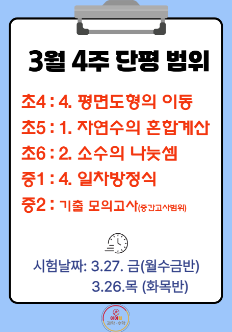 매주 보는 단원평가! 통과한 친구들은 기분좋게 주말을 즐기고! 통과하지 못한 학생들도 씩씩하게 공부하고! 에이원학생들에게 시험이란? 압박이 아니라, 나의 부족함을 확인하는 과정이란걸 느끼며 공부합니다! 주말을 뺏겼다는 아쉬운 마음보다, 다음엔 통과하겠다는 의지가 생깁니다! 커트라인을 넘겼을 때 쾌감이 얼마나 짜릿한지, 겪어본 학생은 압니다! 공부한 학생만이 느낄 수 있는 특별한 감정입니다!! 다음주도 화이팅!!! <img src="https://blogthumb.pstatic.net/MjAyNjAzMjFfNTQg/MDAxNzc0MDc1MzYxNDgz.AU6mfsX2Mj0F4hqz0gHUuVRKK6TZbCaojPZellFDpDcg.4Tr-qosRrcExhTctoJV8KpIKNSJx0BGZy3YwVyqGMIkg.PNG/image.png?type=s3" />