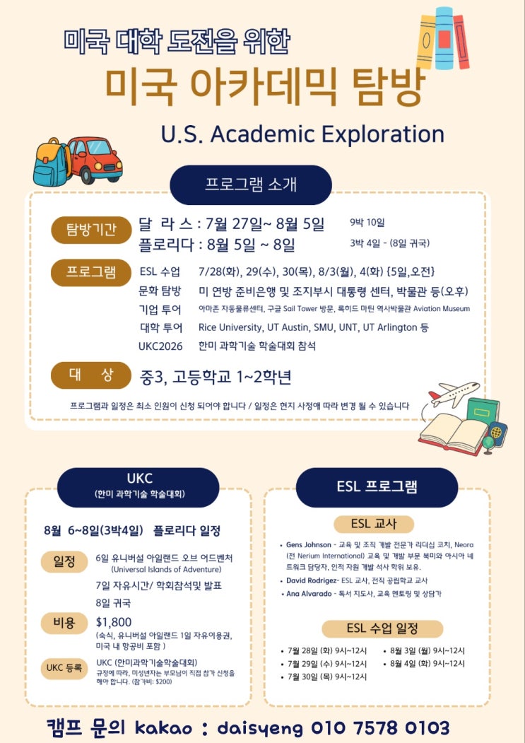 안녕하세요, 데이지입니다:) 미국 대학 진학을 준비하시거나, 차별화된 입시 스펙(Activity)을 고민 중인 분들을 위해 특별한 여름방학 프로그램을 소개해 드립니다^^* 단순한 관광이 아닌, 현직 교수님의 리서치 멘토링부터 NASA, 구글, 아마존 등 글로벌 기업 탐방까지! 2026년 여름, 아이의 미래를 바꿀 소중한 기회, 미국 명문대 입시의 치트키 놓치지 마세요:) 1. [집중 리서치 멘토링] 미국 입시, '교수 추천서'로 승부하세요! 미국 명문대 합격의 핵심은 바로 '학술적 역량'입니다. 9주간 진행되는 온라인 리서치 프로그램은 단순 공부를 넘어 결과물을 만들어내는 과정입니다. 수업 기간: 2026년 6월 3일(수)부터 9주....... <img src="https://blogthumb.pstatic.net/MjAyNjAzMjZfOSAg/MDAxNzc0NDk5NjgzNTQz.itJ8GJ8KVceLt4bWmMzQBOHi0oBqotp5tTEdnlz1POMg.XGSinzqosZMfoPtBfe1Xith4Z74611PStZXvT2kPI8Qg.JPEG/KakaoTalk_20260326_132918743.jpg?type=s3" />