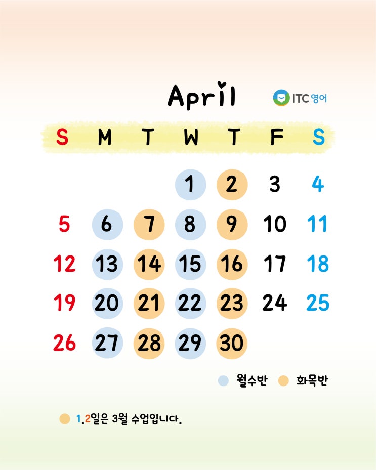 안녕하세요. ITC 소냐쌤입니다. ITC동탄오산점 4월 시간표 알려드려요. ✨ 감사합니다. 함께 보면 좋을 글 ▶️ 언어의 전 영역을 배우는 ITC영어 ▶️ ITC공개수업으로 영어 말하기 ▶️ 함께 꿈꾸는 선생님, 소냐쌤 ITC동탄오산점 체험 수업 예약 <img src="https://blogthumb.pstatic.net/MjAyNjAzMzFfMTI0/MDAxNzc0OTUxOTk0NDg1.iEGGO8R4bgFGaiTt0juxcutVRmu9J2xX5pAGfBcUekUg.YENyg9JS5O-9YXaPqxrYG4_wx7YqV-rVXyipxcK_6NQg.JPEG/202604%BD%C3%B0%A3%C7%A5.jpg?type=s3" />