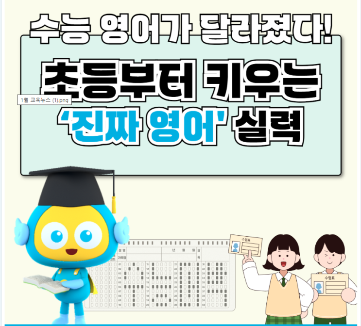 안녕하세요, 탑클래스영어학원입니다. 2026년 새해가 밝았습니다. 모두들 새해 복 많이 받으세요!♥️ 새학기를 맞이하여 많은 친구들이 영어 공부 시작과 상담을 위해 학원을 방문하고 있습니다. 상담하며 안타까울 때는 성실하고 노력하는 학생이 일찍이 공부 올바른 습관을 들이지 못해 잠재력을 다 끌어내지 못했을 경우입니다. 공부의 잠재력은 초등부터 만들어집니다. 이유는 1월 교육 뉴스와 함께 알아보시죠! 올해 수능에서 영어는 절대평가임에도 불구하고 체감 난이도가 매우 높았습니다. 특히 1등급 비율이 3.11%에 그치며, 상위 4% 이내가 1등급인 상대평가 과목과 비교해도 낮은 수준이었습니다. 이에 따라 수능 최저 등급을 맞....... <img src="https://blogthumb.pstatic.net/MjAyNjAxMDZfMTI0/MDAxNzY3NjYwODkzMzg1.ajVHjS-LGt-tMKdzmY6bdgPLR1GFwpSvAEbJsLhttrog.KPROZEE7_paf-QaT0af6PNouW1aP1p4X4KDcQYPUYNcg.PNG/1%BF%F9_%B1%B3%C0%B0%B4%BA%BD%BA_1.png?type=s3" />