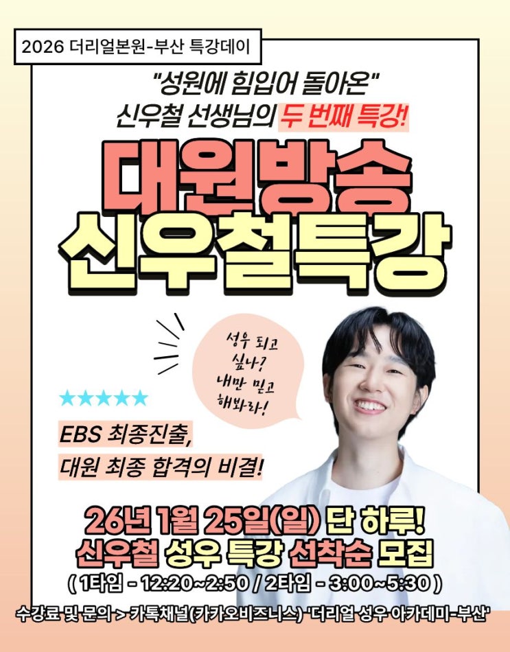 지난 12월, 대원방송 신우철 성우와 KBS 민아 성우님께서 더리얼본원-부산성우아카데미에서 함께해주셨는데요~ 함께해주신 여러분 덕분에 다시한번 돌아왔습니다! 성우라는 꿈, 어디서부터 어떻게 시작해야 할지 막막하셨나요? 특히 부산 분들은 한정된 환경 속에서 고민이 많으셨을텐데요... 더리얼성우본원-부산성우카데미는 서울 학원들과 완.벽.히 똑같은 환경을 제공합니다!! 매체 속 성우들의 목소리에 마음이 움직였던 분, ‘나도 저런 무대 위에 설 수 있을까?’ 고민했던 분들을 위해 더리얼본원에서 특별한 1일 특강 클래스를 준비했습니다! 실제 성우 수업에 직접 참여하는 실전형 수업으로, 현장에서 이루어지는 발성, 대사 분석, 마....... <img src="https://blogthumb.pstatic.net/MjAyNjAxMThfMTE0/MDAxNzY4NzI2NjYyODI1.EMG3psz3Wli3WIEwu4Gn-q6Z0QAVKgxynd50PM9MJ3og.CKyi_0r_MnYGUCxiUJZugImHPT4Ra0o8fgtrM0aZyMgg.JPEG/1.jpg?type=s3" />