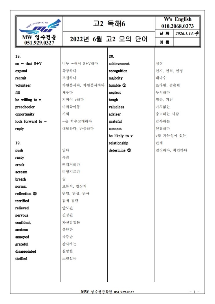 부산 동래구 명륜동 영어 엠더블유MW영수전문학원입니다. 2026년 1월 예비고2 학생들을 위한 2022년 6월 고2 전국연합 학력평가 모의고사 필수단어입니다. 예비고1, 예비고3 학생들과는 다르게 예비고2 학생들은 겨울방학동안에 2학년 1학기 중간고사를 위한 내신대비를 해야합니다. 그래서 현재 본원에서는 모의고사 기출문제를 풀이하면서도, 단어와 문법에 더 포커스를 맞춥니다. 3월에 본격적으로 내신대비가 들어가면 당연히 시험범위에 해당하는 단어와 문법을 다시 학습하겠지만, 그 전에 기본 문법과 단어가 되어있지 않으면 다른 학생들보다 시간이 더욱 많이 걸려 다른 과목에 손해를 보게됩니다. 수업을 하면서 중요단어와 문법을 매....... <img src="https://blogthumb.pstatic.net/MjAyNjAxMTJfMjY2/MDAxNzY4MTY2MTM1NDU3.7bP3p58RAKzP_EFuOT5jduOQhuqHKt0ItAm87N1zcBYg.3uoWs-jAVFjJhDOP5DZmyVWP6__TuWA4afKbMjYGXSgg.JPEG/%B5%B6%C7%D85_2022%B3%E2_6%BF%F9_%B0%ED2_%B8%F0%C0%C7%B4%DC%BE%EE_1845_1.jpg?type=s3" />