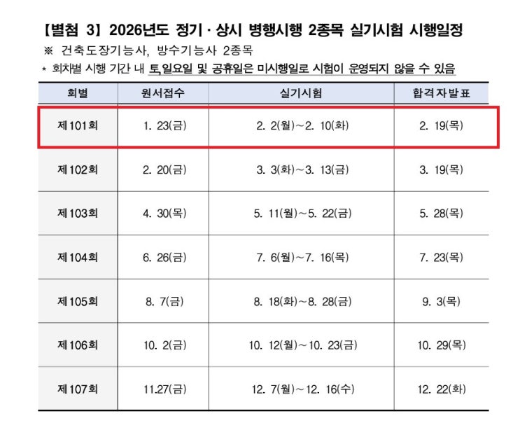 2026년도 1월~2월 부산방수기능사전문학원 수강안내 (101회~102회 상시기능사, 제1회 정기기능사 대비반) 부산방수기능사전문학원에서는 2026년 1월과 2월에 시행하는 101회~102회 상시기능사와 제1회 정기기능사 대비반을 모집하고 있습니다. 방수기능사 시험접수는 큐넷(www.q-net.co.kr)에서 본인이 직접 접수하시면 됩니다. 시험접수 일자는 아래에 있는 시험일정표를 참조하세요. 2026년1월23일(금요일)에는 101회 상시기능사 접수가 있고 2월2일(월요일)~5일(목요일)에는 제1회 정기기능사 접수가 있으니 잊지마시고 큐넷에 접속하여 시험 접수하시기 바랍니다. 시험접수에 성공하신 분들이나 아직 접수하지 않으신 분들은 저희 학원에 일....... <img src="https://blogthumb.pstatic.net/MjAyNjAxMjVfMTQz/MDAxNzY5MzUwNzMwOTcy.UdTfxl60sBuklK44Oj1XlTwHTqmVJDoNYOjzLHiU-Ksg.MBtDBQ-zvQokTxst4J0XInQHJ2RO9Yt9XfGOeYJWFP8g.JPEG/2026%B3%E2_%B9%E6%BC%F6%B1%E2%B4%C9%BB%E7_%BB%F3%BD%C3%BD%C3%C7%E8%C0%CF%C1%A4%2826.01.23%29.jpg?type=s3" />