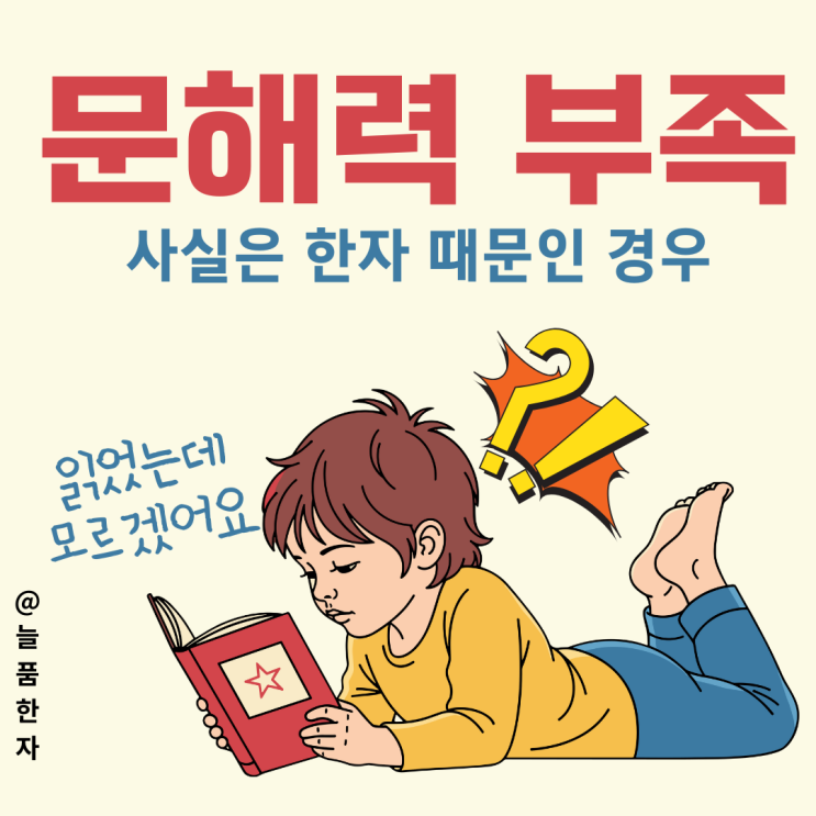 단어를 한자 뜻 중심으로 이해하기 무작정 외우지 마세요. 늘품한자 애니메이션과 신 교재로 어휘력을 키워요! 2026년 1월부터 시작된 애니메이션 수업! 만족도 짱이예요. 짱~짱~짱~ 읽었는데 모르겠어요ㅠㅠ 요즘 학부모 상담에서 가장 자주 듣는 말 중 하나가 있습니다. “아이가 책은 읽는데, 읽고 나서 무슨 말인지 모르겠다고 해요.” 그래서 많은 분들이 문해력 부족의 원인을 독서량이나 집중력 문제로 생각합니다. 하지만 수업 현장에서 아이들을 오래 지켜보면, 실제 원인은 다른 경우가 많습니다. 바로 한자 어휘를 뜻으로 이해하지 못한 상태입니다. 핵심단어가 막히면...글 내용이 이해가 안 돼요. 문해력은 글자를 빨리 읽는 능력이....... <img src="https://blogthumb.pstatic.net/MjAyNjAxMjZfMzIg/MDAxNzY5Mzc5MjQ0ODE3.VC7_PHZR_onYyl1caBSMfulgl-jycy9m1zSomzAj0mMg.H7q8uV_HBGcFp84L1TMHLMloDz9j17-5hDlXJS7ciuMg.PNG/20260126_readbutdontknow.png?type=s3" />