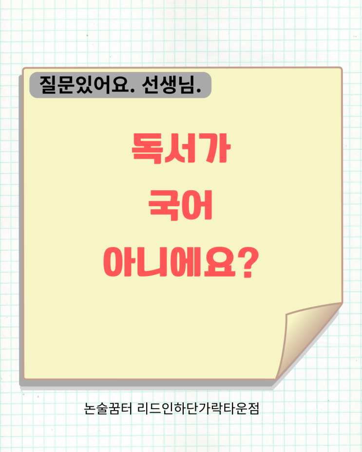 Q. 독서가 국어 아니에요? 많은 학부모님들이 독서를 국어의 한 영역으로 생각하십니다. 하지만 교육 현장에서 보면, 독서는 국어 자체라기보다 국어 실력을 떠받치는 바탕에 가깝습니다. A. 국어 성적은 ‘문제 풀이’로 만들어지지 않습니다. 국어 실력은 ✔ 글을 읽고 ✔ 의미를 이해하고 ✔ 질문이 요구하는 바를 정확히 파악하는 힘, 즉 문해력에서 출발합니다. 이 힘이 부족하면 국어뿐 아니라 수학, 사회, 과학까지 함께 흔들리게 됩니다. 문제를 읽지 못하고, 개념을 이해하지 못하며, 서술형과 수행평가에서 막히게 되기 때문입니다. 그래서 독서는 국어 시간에만 필요한 활동이 아니라 모든 학습을 가능하게 하는 기초 체력입니다. 국....... <img src="https://blogthumb.pstatic.net/MjAyNjAxMjlfMTIy/MDAxNzY5Njc1NzU3MTQw.CeHz9QWnUIQzAl5rk3gWhujDRWh-8hQqAUhq90d3nlIg.7gpcvQZ2j4f-3Nxmj7kk5LbgT8UznbiYSfB4l7ricBog.PNG/12.png?type=s3" />