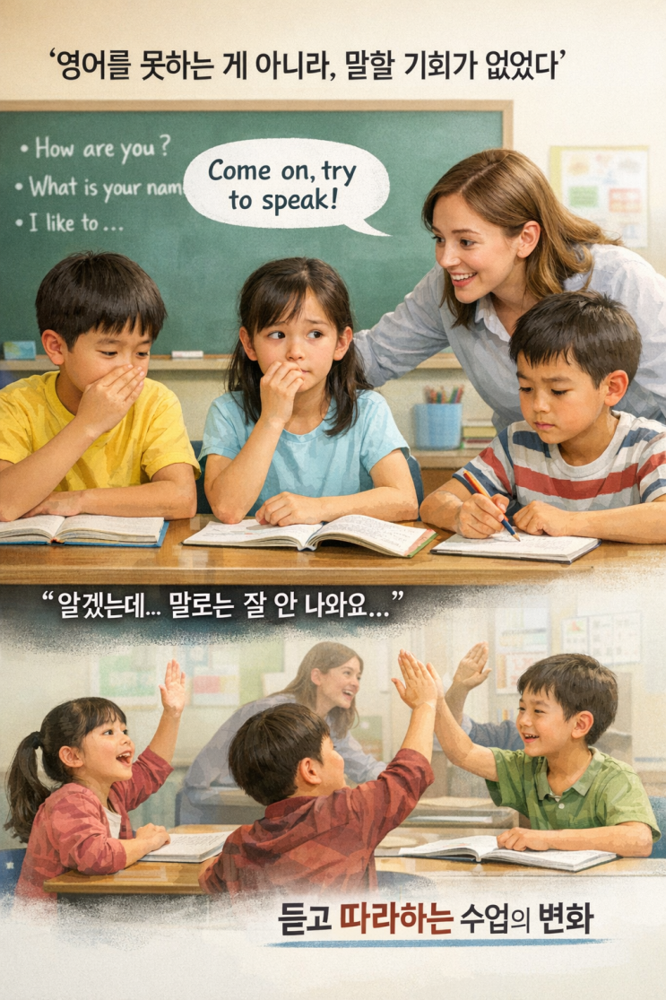 영어를 3년, 5년, 심지어 10년을 배웠는데도, 막상 한 문장을 말하려고 하면 입이 떨어지지 않는 아이들. 이게 정말 아이들 문제일까요? 사실 대부분의 경우, 아이들이 아니라 ‘배우는 방식’의 문제입니다. ‘영어를 못하는 게 아니라, 말할 기회가 없었다.’ 많은 아이들이 이렇게 말합니다. “알겠는데… 말로는 잘 안 나와요.” 이 말은 굉장히 중요합니다. 아이들은 이해를 못한 게 아니라, 사용해본 적이 없는 것입니다. 지금까지의 영어 수업을 떠올려 보면 대부분 이렇습니다. • 선생님이 설명한다 • 아이는 듣는다 • 문제를 푼다 • 정답을 확인한다 이 과정에서 아이가 영어를 직접 말하는 시간은 거의 없습니다. 영어는 ‘지식’....... <img src="https://blogthumb.pstatic.net/MjAyNjAxMTRfMTQ5/MDAxNzY4MzYyOTg3MTg3.qTDLBAwMV65U7ARNAxrTpagXOFflCoIOHaJQlul9AZYg.qjws81wMjrEBhWhtfmHlKyp5Em8-B4zed8HR4LWXDsAg.PNG/ChatGPT_Image_2026%B3%E2_1%BF%F9_14%C0%CF_%BF%C0%C8%C4_12_53_34.png?type=s3" />