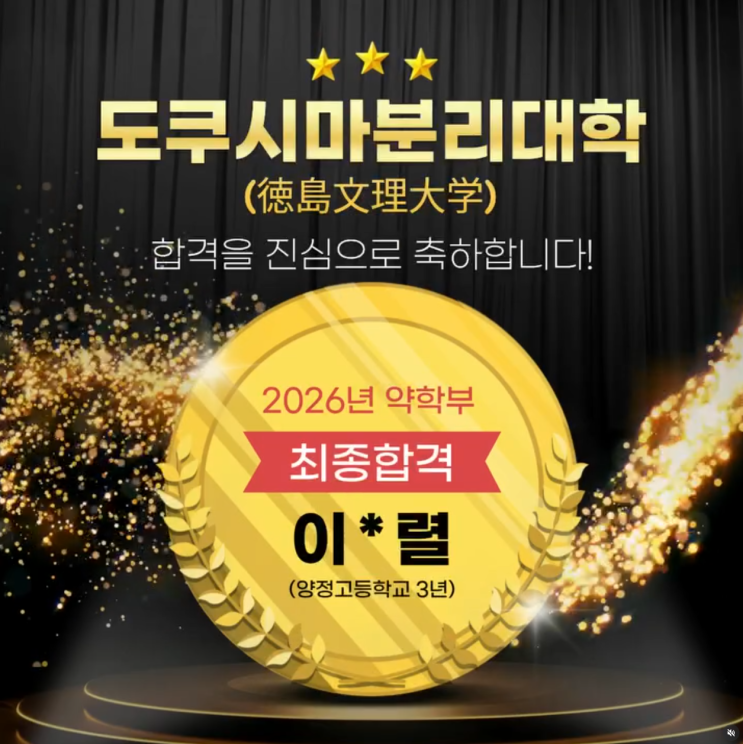 한 걸음 한 걸음, 꿈에 다가간 결과 타마고 일본어학원 학생이 도쿠시마분리대학 약학부 "학원장 추천전형"으로 최종 합격했습니다 매일 늦은 시간까지 남아 공부하던 그 시간들이 결국 멋진 결실로 돌아왔어요 진심으로 축하합니다 당신의 일본 유학, 타마고가 함께합니다. #타마고일본어학원 #부산일본어학원 #사하일본어 #사하구일본어학원 #명지일본어 #강서구일본어학원 #EJU #일본어기초 #부산일본어공부 #초중고일본어 #성인일본어 #일본어스터디 #일본유학준비 #일본유학상담 #타마고에그잉글리쉬학원 #부산영어학원 #사하영어 #사하구영어학원 #명지영어 #강서구영어학원 #토익학원 #토플학원 #명지토익 #명....... <img src="https://blogthumb.pstatic.net/MjAyNjAxMTVfMTA3/MDAxNzY4NDg2OTYzNDk1.f6Oi8uL56nK-Pb2Sq8-UO6VvGvYzZyIrYnaM1q7FbqUg.mjtxIKwy5VBBGH3jrra91AVS-_IDbaipPZ5OOaGuEr4g.PNG/image.png?type=s3" />