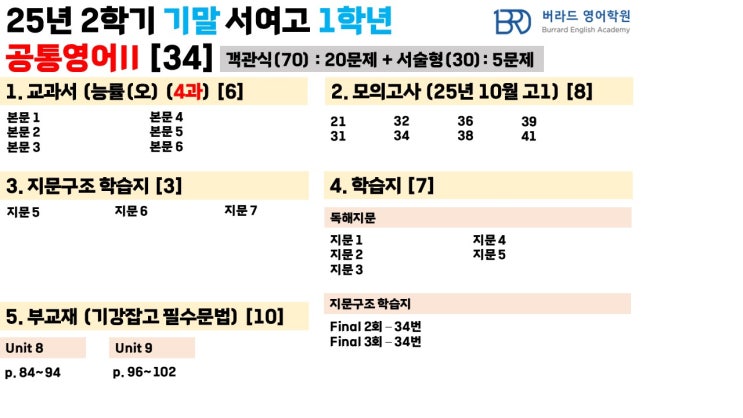 안녕하세요 감천동 영어 수학학원 버라드&그랜빌입니다! 현재 저희 학원은 외고 자사고뿐만 아니라 주변에 위치한 다양한 학교들을 집중적으로 케어하고 있습니다 ✌️ 오늘은 2025학년도 서여고 1학년 2학기 기말고사 공통영어II 시험을 분석해 드리고자 합니다 이번 서여고 공통영어II 시험 범위입니다 이번 기말고사에서는 객관식 20문제 & 서답형 5문제가 출제되었습니다 수업 학습지의 문제 출제 비율이 가장 높으며 모의고사도 큰 비중을 차지하고 있습니다 어법 문제가 가장 많이 출제되어 문법 개념을 파악하고 적용하는 것이 가장 중요했던 것 같습니다 어법 유형에서는 예문을 많이 비교해 보고 개념은 정확하게 이해하는 것이....... <img src="https://blogthumb.pstatic.net/MjAyNjAxMTVfMzkg/MDAxNzY4NDYxNDMzOTUx.swDZDR0Ub3EGfO30Irod6Icz6RU2SOeZZm8ZFEHMFvsg.iQMp2-zIu2qreXXzu4jSholfQbs69d_CIdxHieQzKmIg.JPEG/2025%B3%E2_%BC%AD%BF%A9%B0%ED_1%C7%D0%B3%E2_2%C7%D0%B1%E2_%B1%E2%B8%BB%B0%ED%BB%E7_%BD%C3%C7%E8%B9%FC%C0%A7_%C1%A4%B8%AE_%C3%D6%C1%BE%B0%CB%C5%E4_%C3%D6%BD%BD%BE%C6.jpg?type=s3" />