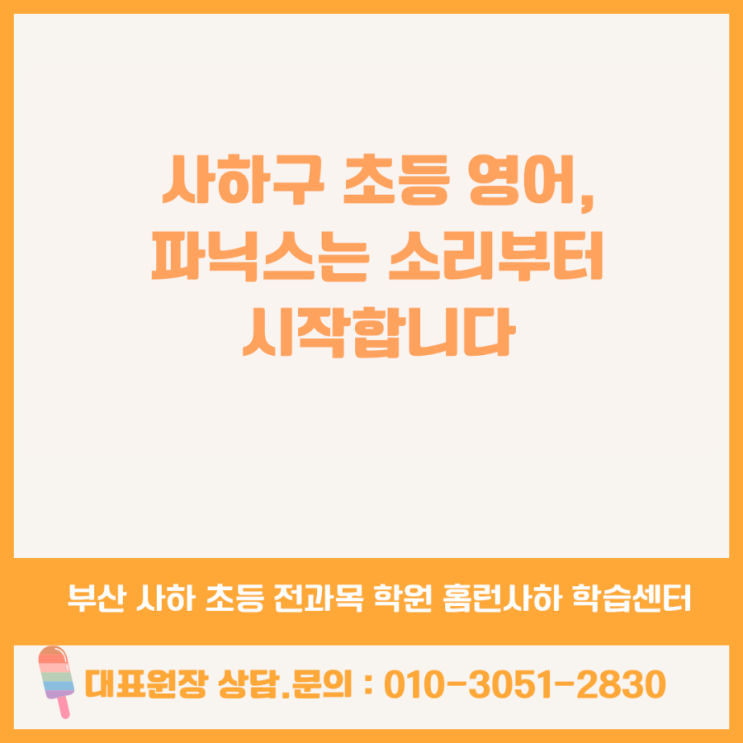 안녕하세요, 사하구 초등중등 수학영어 전문 홈런사하학습센터학원 김은선 원장입니다. 영어를 처음 배우는 아이들을 보면, 알파벳은 알고 있지만 단어를 보면 읽지 못하거나 읽기는 해도 소리에 자신이 없어 멈칫하는 경우가 많습니다. 이 시기의 영어에서 가장 중요한 것은 얼마나 많은 단어를 외우느냐가 아니라, 영어 소리를 정확하게 듣고 따라 말해 보는 경험입니다. 그래서 홈런사하학습센터학원의 초등 영어 수업은 진도를 앞서 나가기보다 파닉스를 통해 영어 소리의 기초를 단단히 만드는 것에 가장 큰 비중을 두고 있습니다. “영어의 시작은 암기가 아니라, 소리를 제대로 듣고 말하는 경험입니다.” 사운드체인저 파닉스 수업의 핵....... <img src="https://blogthumb.pstatic.net/MjAyNjAxMTdfMzEg/MDAxNzY4NjMzMTk5OTEz.NLrzuhijX_2fiYVhGCshpQJ117QoEbIWHEEabKrWSmsg.4RItWvNl2cC0XQ_Zpq3-dWoVT_4aX6pjwQoEU3Fy2qog.PNG/900%A3%DF16%A3%DF20260117%A3%DF154603%A3%DF0015.png?type=s3" />