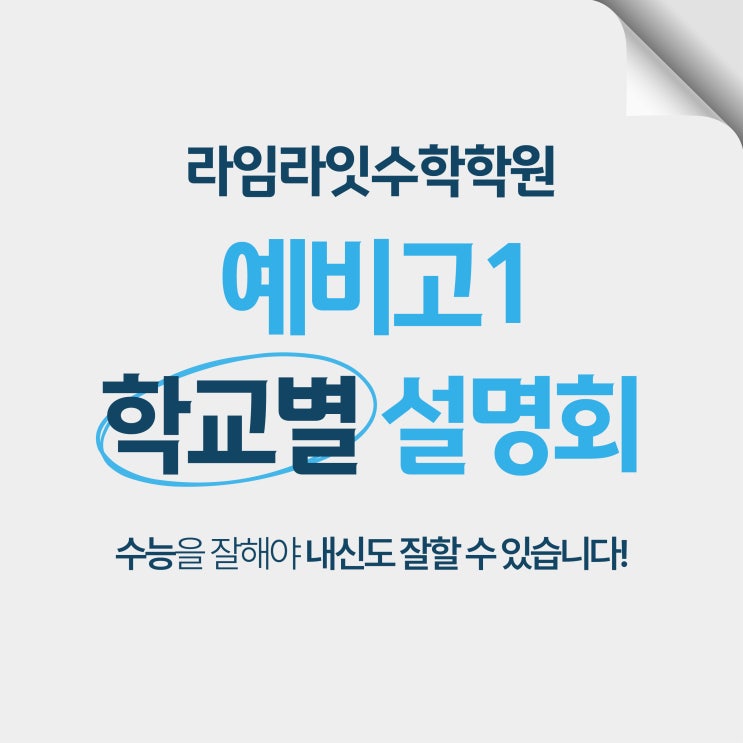 중학교와 고등학교의 수학은 분명히 다릅니다. 학교별 전략부터 완벽하게 정리해야 합니다! 라임라잇수학학원에서는 예비고1 학생과 학부모님을 대상으로 학교별 학습 환경과 내신 구조를 중심으로 설명회를 진행합니다. 이번 사직동 수학학원 예비고1 설명회는 단순한 선행 안내가 아니라, 고등수학을 어떻게 준비해야 하는지에 대한 ‘방향 설정’에 초점을 맞췄습니다. 각 학교별 학습 환경과 내신 성향 및 준비 방식, 그리고 예비고1 시기에 반드시 준비해야 할 학습전략을 구체적으로 안내해 드립니다. 예비고1 수학에서 가장 크게 달라지는 점 학교별 내신 출제 경향과 대비 방향 중등식 공부에서 벗어나야 하는 이유 예비고1 시기에 반드....... <img src="https://blogthumb.pstatic.net/MjAyNjAxMDlfNjMg/MDAxNzY3OTUwNzg0Mjcy.E2GOXobwIA6lPoRNgxJyQc8rbus-gUJqvXpluChET2cg.XUw_P0W0qPR_eQ69aC3TQIRtytBghB4krSkI4xnnmIMg.JPEG/0108_예비고1설명회-02.jpg?type=s3" />