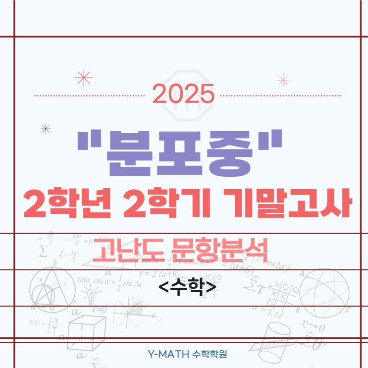 분포중 학생 여러분 안녕하세요! 와이매쓰 수학학원입니다. 겨울방학이라 정신없죠? 추운 날씨, 공부하기가 쉽지는 않은 계절입니다. 아마 이 글을 보고 있을 학생들은 2026년에 2학년이 된 학생들이겠네요. 선생님들은 항상 여러분의 실력향상을 응원하고 있습니다! 오늘은 2025년 분포중 2학년 2학기 기말고사에 대해 분석해보려고 해요. 총 평 시험문제 대부분은 아마 공부를 열심히 했다면 무난하게 풀 수 있는 평이한 난이도였습니다. 그렇다고 모든 문제가 쉬웠냐? 그건 아닙니다! 아래에서 보게 될 15번 문제는 매우 까다로웠습니다. 그 외 문제들은 기본기를 묻는 것에 가까웠기 때문에, 역시 기본기가 탄탄해야하겠다고 볼 수 있겠습니....... <img src="https://blogthumb.pstatic.net/MjAyNjAxMTVfMjkx/MDAxNzY4NDY4Njc0NDA4.cwYFqZHGto-1-UUcsU8WJYwQIzHaqjOmIZl5iB2XDOYg.sNLVQ789U0NVi68p1VeTMWOIpRSTV6DWFeZdoUQc8wog.JPEG/%BA%D0%C6%F7%C1%DF_2-2_%B1%E2%B8%BB.jpg?type=s3" />