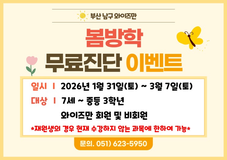 안녕하세요 ! 부산 남구 와이즈만입니다^^ 오늘은 봄방학 무료진단 이벤트를 안내드리려합니다 ! 대상 : 7세 ~ 중등3학년 부산 남구 와이즈만 회원 및 비회원 *회원의 경우 현재 수강하지 않는 과목에 한해 진행 가능* 일시 : 2026년 1월 31일(토) ~ 3월 7일(토) 2026년 새학기를 맞이하여 봄방학 무료진단기간 통해, 우리 학생들의 실력을 다시 한번 확인해보는 것도 좋을 것 같습니다^^ 무료진단의 경우 희망하시는 분들이 많아, 상담시 대기하셔야 할 수 있습니다 이부분 양해 부탁드립니다 :) 인스타그램, 카카오톡, 진단예약 바로가기 @bs_namgu_weizmann | Instagram | Linktree Linktree. Make your link do more. linktr.ee 전화문의 : 0....... <img src="https://blogthumb.pstatic.net/MjAyNjAxMTVfMjMy/MDAxNzY4NDY1NjA4NTY4.vsX12G_T6dQLrZktKej3Ba4cBpOxKB_2gHH6t_HnSHgg._iMDKieo0ubhTtnDGEmhfAnkWT-CehsRgfviGm8a_Akg.JPEG/%B9%AB%B7%E1%C1%F8%B4%DC-%C0%CC%BA%A5%C6%AE_%BA%B9%BB%E7%BA%BB-001.jpg?type=s3" />