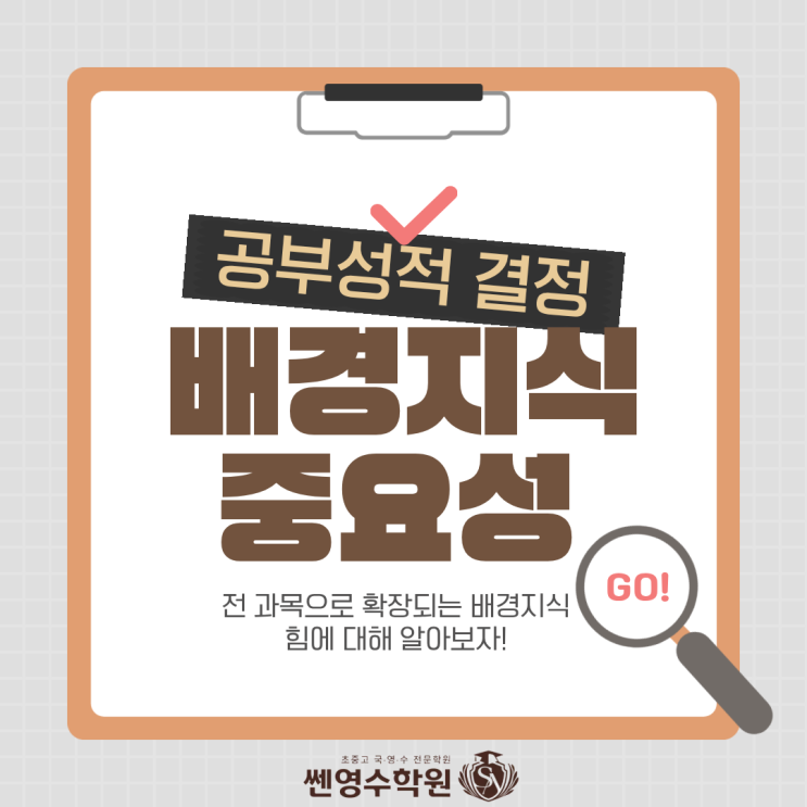우리 아이 학습 격차, 결국 '배경지식'에서 결정됩니다 안녕하세요~ 쎈영수학원입니다! 드디어 설레는 새 학기, 3월이 시작되었습니다! 오늘은 새로운 학년의 공부 성패를 좌우하는 핵심 요소인 '배경지식'의 중요성에 대해 깊이 있게 다뤄보려 해요. 대구 신암동 국어학원을 찾는 학부모님들께서 3월 새 학기에 꼭 읽어보시면 좋을 정보를 준비했답니다~! 변화하는 교육과정, 지식의 '양'보다 '활용'이 핵심입니다 요즘 공부에서 ‘배경지식’은 단순히 상식을 많이 알고 있느냐 문제가 아니라, 학습의 깊이와 성취도를 좌우하는 핵심 요소가 되고 있습니다. 2022 개정 교육과정은 ‘무엇을 아느냐’보....... <img src="https://blogthumb.pstatic.net/MjAyNjAzMDRfMTc2/MDAxNzcyNjE3MzM1MzE1.X_i_iua7WJzlijsQx262A8ajwNUYYTK9WTd0xJPmGE0g.PJztk0rfaH1RorvpAgRXBVDw6FKKkCGbZ1x8r-9CUXEg.PNG/%B1%B9%BE%EE_%B8%DE%C0%CE%BB%E7%C1%F8.png?type=s3" />