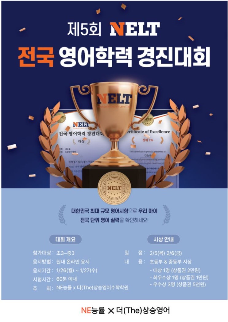침산동 영어학원 더상승영어수학학원에서는, '감'이 아닌 '이해'로 영어 실력을 만들어 갑니다. 안녕하세요 침산동 중·고등 영어 전문 더상승영어수학학원입니다. 더상승 학원에서 겨울방학을 맞아 초,중등 넬트(NELT)경진대회 준비 과정을 특별하게 운영하고 있습니다. 단순히 문제만 푸는 학습이 아닌, 근본적인 영어 실력과 사고력을 키우는 더상승 영어학원만의 넬트(NELT)경진대회 준비 전략을 소개 드리려 합니다. 넬트(NELT) 경진대회, 왜 중요할까요? 넬트경진대회는 단순히 영어 지식을 평가하는 것을 넘어, 학생들이 실생활에서 영어를 얼마나 효과적으로 활용할 수 있는지? 영어로 사고하는 능력을 측....... <img src="https://blogthumb.pstatic.net/MjAyNjAxMTRfMjI5/MDAxNzY4Mzg0MTM1ODkz.xS7pQjC4O04y7FlTUuMdzNvlC3CsZQzXY2Susdwr1jIg.MYcXsBwFMloyxrf6ltBDYTCffzQNh7PgnP9783GYOakg.JPEG/%C1%A65%C8%B8%B3%DA%C6%AE%B0%E6%C1%F8%B4%EB%C8%B8%C6%F7%BD%BA%C5%CD_%282%29.jpg?type=s3" />