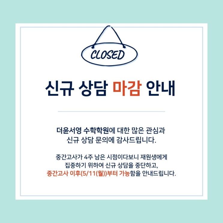 [1학기 수학 내신 대비] 더윤서영 수학학원 신규 상담 마감 안내