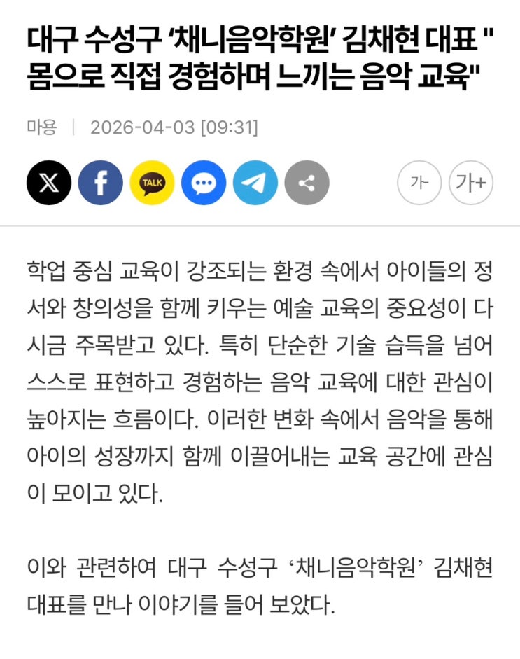 안녕하세요! 범어동피아노학원 범어동음악학원 수성동피아노 수성동음악학원 범어에일린의뜰 정문에 위치한 채니음악학원 입니다! 최근 저희 학원이 인터뷰 기사로 소개되는 기회를 갖게 되었습니다 ^^ 아이들과 함께하는 수업, 그리고 음악을 통해 아이들이 성장하는 과정을 좋게 봐주셔서 이렇게 기사로 소개될 수 있었던 것 같습니다. 채니음악학원이 중요하게 생각하는 것은 단순히 피아노를 잘 치는 것이 아니라 아이들이 음악을 즐기고 자신감을 얻는 과정입니다. 한 곡을 완성하며 느끼는 성취감, 무대 경험을 통해 얻는 자신감, 그리고 음악을 통해 표현하는 감정까지 이 모든 과정이 아이들에게 좋은 성장 경험이 되기를 바라는 마....... <img src="https://blogthumb.pstatic.net/MjAyNjA0MDNfMTI2/MDAxNzc1MTg5MDk1Mjkx.yD2Plj3pzbJJ4xvhMACnPPOFaiXyZg01Lo4NqGQWPZgg.xRzOCKhw4aEIrWT9l_on2nAzb7GXSPNumbS5SJxOB9Qg.JPEG/IMG%A3%DF7471.jpg?type=s3" />