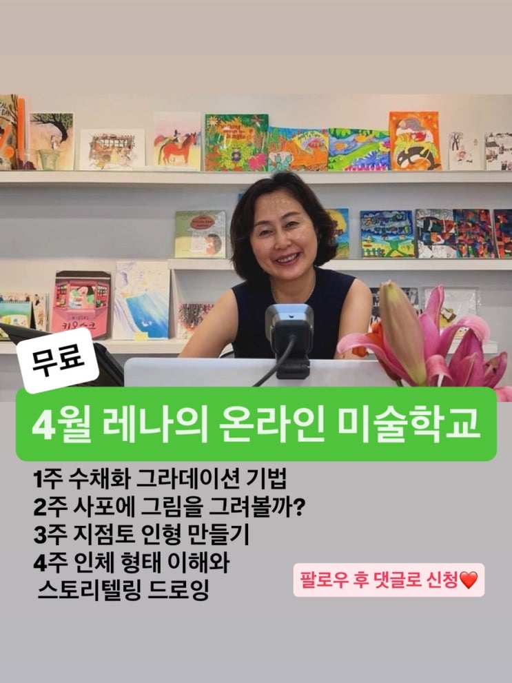레나의 온라인 미술학교 4월 수업 커리큐럼입니다^^ 수업은 무료입니다 저의 은퇴 후 재능기부 프로젝트 1탄이지요 호호 수업 신청은 팔로우 후 댓글로 신청하세요 미술학원에 다니지 않는 친구들에게 이 수업을 많이 소개해 주세요^^ 온라인에서도 충분히 좋은 수업을 받을 수 있어요 저 빈말 안해요 ㅎㅎㅎ #레나의그림책정원 #레나의온라인미술학교 #온라인미술 #대구그림책수업 #대구그림책 <img src="https://blogthumb.pstatic.net/MjAyNjA0MDVfMzEg/MDAxNzc1Mzg1MDQyMDkz.6D0hVf9yr3-7PFBNUiqHtRew6-WLsOeahhDhz2D-Ewgg.YcBqjNm5Ksr9v6Dpjt4qyorvlrizygn1lpr1Inu4HRUg.JPEG/36E5F45D%A3%AD9411%A3%AD4382%A3%AD84F0%A3%ADE2B3548759A5.jpg?type=s3" />