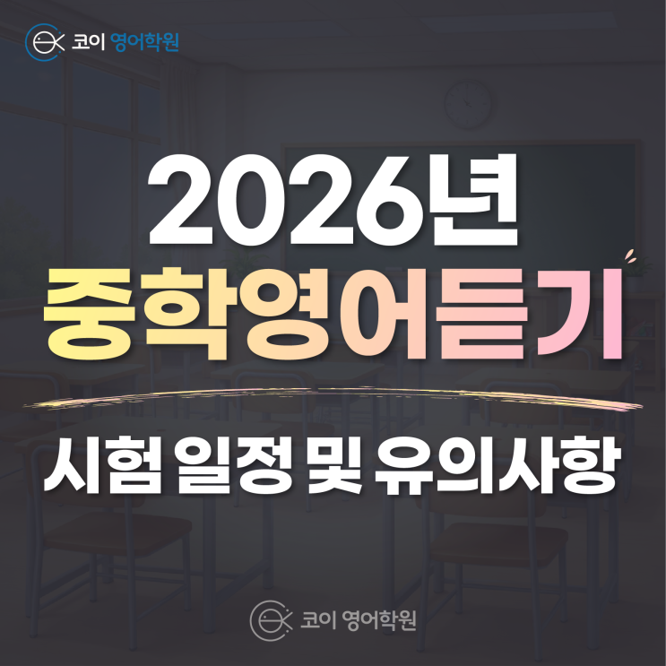 2026 중학영어듣기평가 시험 일정 안내 소식을 전해드립니다. 안녕하세요, 학부모님 코이영어학원에서 인사드립니다. 중학생 자녀를 둔 학부모님들께서 매년 빠짐없이 챙기셔야 하는 시험이 있습니다. 바로 중학 영어듣기평가입니다. 겉으로 보기에는 간단한 시험처럼 보이지만, 실제로는 집중력과 실전 대응 능력에 따라 점수 차이가 날 수 있는 시험입니다. 특히 이 시험은 대부분 학교에서 내신 수행평가에 반영되기 때문에 결코 가볍게 볼 수 없는 시험입니다. 오늘 코이에서는 내일부터 진행되는 2026년 중학영어듣기평가 시험 일정을 전해드리는 시간을 준비했습니다. 영어듣기평가는 어떤 시험이며, 각 학년에 따라 어떻게 시험 일정이 진....... <img src="https://blogthumb.pstatic.net/MjAyNjAzMzBfODEg/MDAxNzc0ODY4MDE5MjA5.YRdgwXUL2iqQ9cDDcz_uyiYawqDA4h8p6Nh_v8IIQ_Yg.-HMIEINnRmJdcLbz1_9k1Ka7fsblCHIMJnvJvGavZ6Mg.PNG/%B4%EB%C1%F6_3_%BB%E7%BA%BB.png?type=s3" />