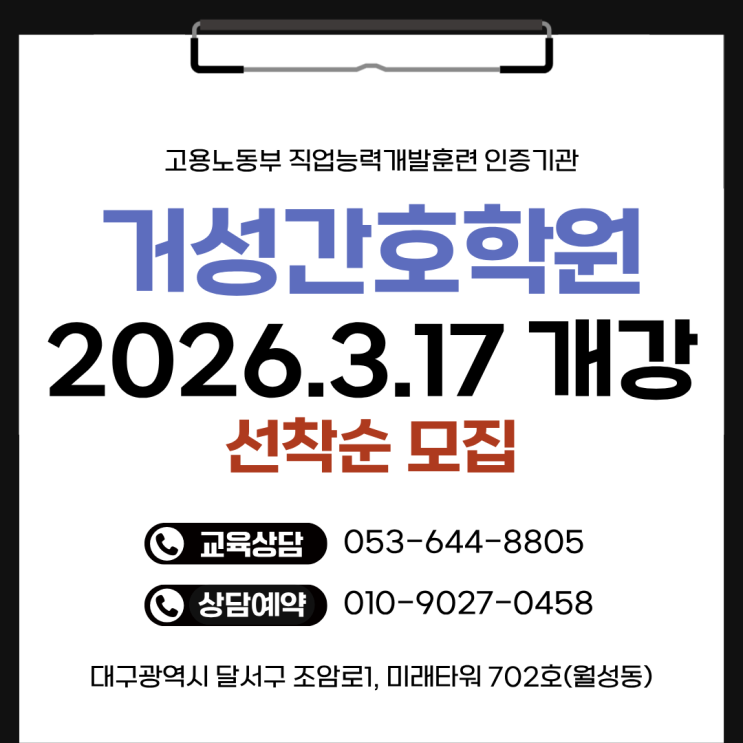 대구달서구간호조무사학원 추천 취업률로 증명하는 거성간호학원 2026년 3월 17일 개강 간호조무사 자격증을 준비하려고 보면 가장 먼저 드는 고민이 있습니다. "대구에 간호학원이 이렇게 많은데 어디를 선택해야 하지?" "간호조무사 과정을 잘 진행할 수 있을까?" "자격증을 따도 취업까지 할 수 있을까? 간호조무사 자격증은 단순히 시험만 준비한다고 취득할 수 있는 자격증이 아니라 이론 교육과 병원 실습, 국가시험 준비 과정이 함께 이루어져야 하는 과정형 자격증입니다. 그렇기 때문에 어떤 간호학원을 선택하느냐에 따라 학습경험과 취업 결과가 크게 달라질 수 있습니다. 특히 처음 간호조무사 과정을 알아....... <img src="https://blogthumb.pstatic.net/MjAyNjAzMDZfNTkg/MDAxNzcyNzgwNjgwMzc5.2UMxi_u0spgagcb7QUkJEsAI83Pv0Ze7TBTF13jrLxUg.flqX_QEQGxSELdhYTyV2rRHkZ-F6x6t1HvGCkGBbvnIg.PNG/1.png?type=s3" />
