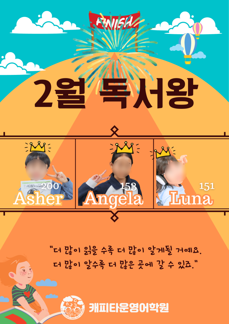 2월 독서왕을 소개합니다! 2월에는 100권 넘는 다독왕이 3명이나 탄생했어요! 200권을 넘게 읽은 학생이 1등이 되었답니다! ❤️ 서창동에서 영어책을 많이 읽기로 소문난 캐피타운영어학원이지만, 책을 매일 꾸준히 읽고, 영어 원서를 100권, 200권을 읽는다는 것은 쉬운 일이 아니죠! 무엇보다 가장 어려운 것은 꾸 준 히! 인데, 이 어려운걸 우리 캐피키즈가 해냈답니다. CONGRATS! 1등 Asher 200권 2등 Angela 153권 3등 Luna 151권 세 캐피키즈 모두, 1시간씩, 30분씩 수업 전, 후로 따로 시간을 내어 매일 독서를 한 학생들이에요. (사실 Asher은 제가 마지막으로 본게 220권 이상이었는데, 북로그를 바꾸며 확인할 수가 없어 200권으로 낮....... <img src="https://blogthumb.pstatic.net/MjAyNjAzMTJfNzgg/MDAxNzczMzAzNzMxMjgx.8hhdvvShc0Lbt-jM6i53JbXMPH4WUoRd3rmdkp0Pb7Ig.e_fCTetK1Dtu1y7hrY6vU-L7QgZGTERngCDKFtWCzgwg.PNG/2025%B3%E28%BF%F9_%B5%B6%BC%AD%BF%D5_%281%29.png?type=s3" />