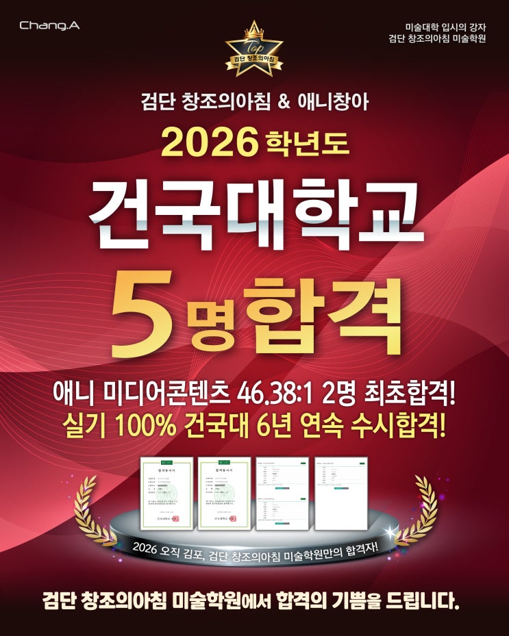안녕하세요. 검단 창조의아침 미술학원 & 애니창아 만화학원 입니다~^^ 2026학년도 미대 수시 입시가 막바지에 이르며 학생들과 학부모님들께서도 마음 졸이며 결과를 기다리셨을 시기일 텐데요. 차가워진 날씨와는 달리 학원에는 기쁜 합격 소식이 이어지며 학생·학부모님 모두에게 큰 보람과 안도감을 전해주고 있습니다~ 남아있는 정시 입시도 좋은 결실을 맺고 모두가 기쁜 2026년이 되길 기원합니다~^^ 오늘은 많은 학생들이 가고 싶어 하는 학교 중 한 군데인 건국대학교 합격 소식입니다. 2026학년도 건국대학교 수시 합격 성과 ✔ 건국대학교 수시 합격 5명 배출 ✔ 애니·미디어콘텐츠 46.38:1 경쟁률 속 최초 합격 2명 ✔ 실기....... <img src="https://blogthumb.pstatic.net/MjAyNTEyMTVfMjIg/MDAxNzY1Nzk1OTYzNTA0.yQMBgadh2ke00OGOG3SBhHar7qK0f6IEJiv0MtSxRN4g.mreKgEdajo1dabgJfsLfvIcJ1jApt6jHCsoZVORIzkwg.JPEG/26_%BB%F3%B8%ED%B4%EB_%B8%ED%C1%F6%B4%EB_%B0%C7%B1%B9%B4%EB_11.jpg?type=s3" />