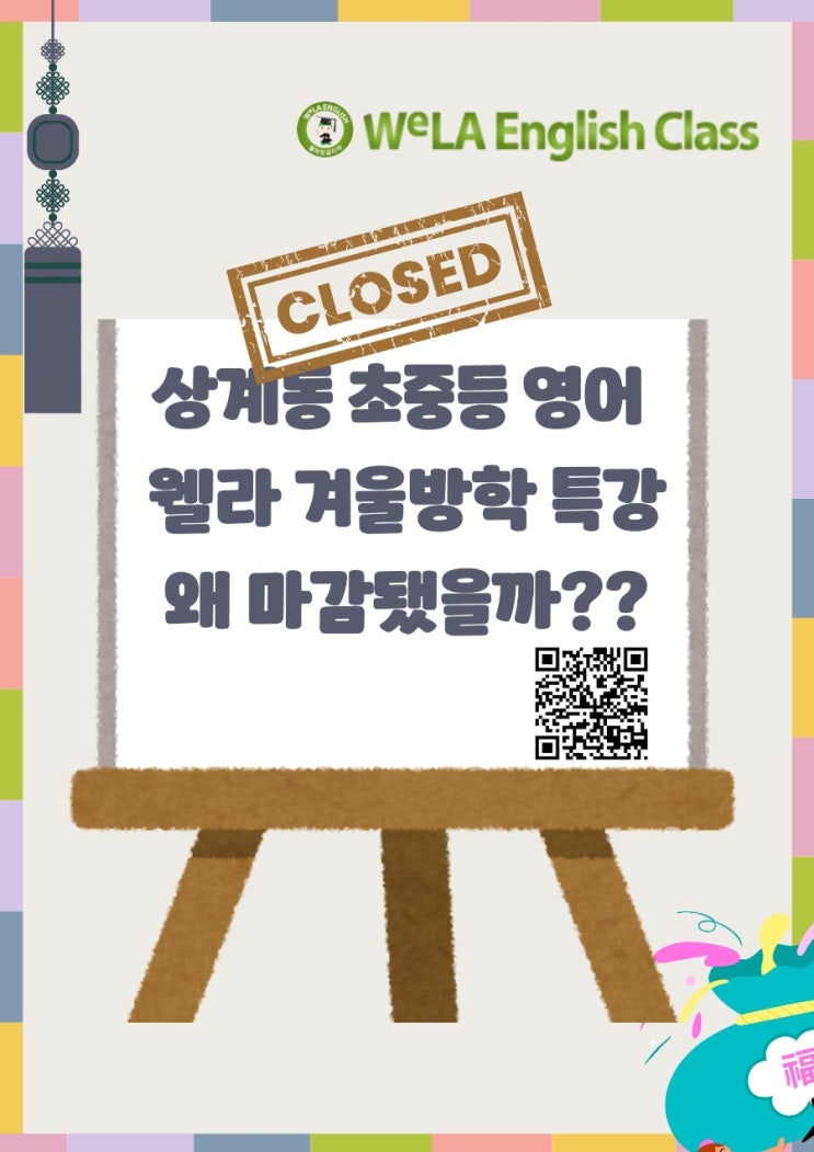 상계동 학부모가 선택한 웰라 겨울방학특강 성황리 진행중!! NELT 진단부터 원서리딩까지 문법 리딩 실력 변화가 보입니다. feat. 웰라잉글리쉬 1월 소식 안녕하세요! 웰라영어입니다~^^ 붉은 말의 해, 병오년을 맞으며 새해 인사 드립니다. 지난 한해는 우리 웰린이, 웰주니 한 명 한 명의 걸음을 놓치지 않고 함께 달려온 지난 시간들이었습니다. 단단헌 기본기와 스스로 생각하는 힘을 키우며 무엇보다 마라톤에 비유되는 영어학습이기에 우리아이들 영어정서에도 정성을 쏟았습니다!! 조급함 대신 진짜 성장을 위한 방향설정으로 새해에도 '말'뿐인 약속이 아닌, 늘 그래왔듯 실질적인 실력 향상으로 신뢰에 보답하겠습니다 이....... <img src="https://blogthumb.pstatic.net/MjAyNjAxMTJfMTYx/MDAxNzY4MTQ0MTk4MjY5.Mqc26g_5armOFziPEl9LMfP7fhXtQki-i6DRWjsc_Uog.9T0MV-ziHEZI2J6Irs4jKoNPGemxLBhXHYxVCbgpduwg.JPEG/900%A3%DF1768143217510.jpg?type=s3" />