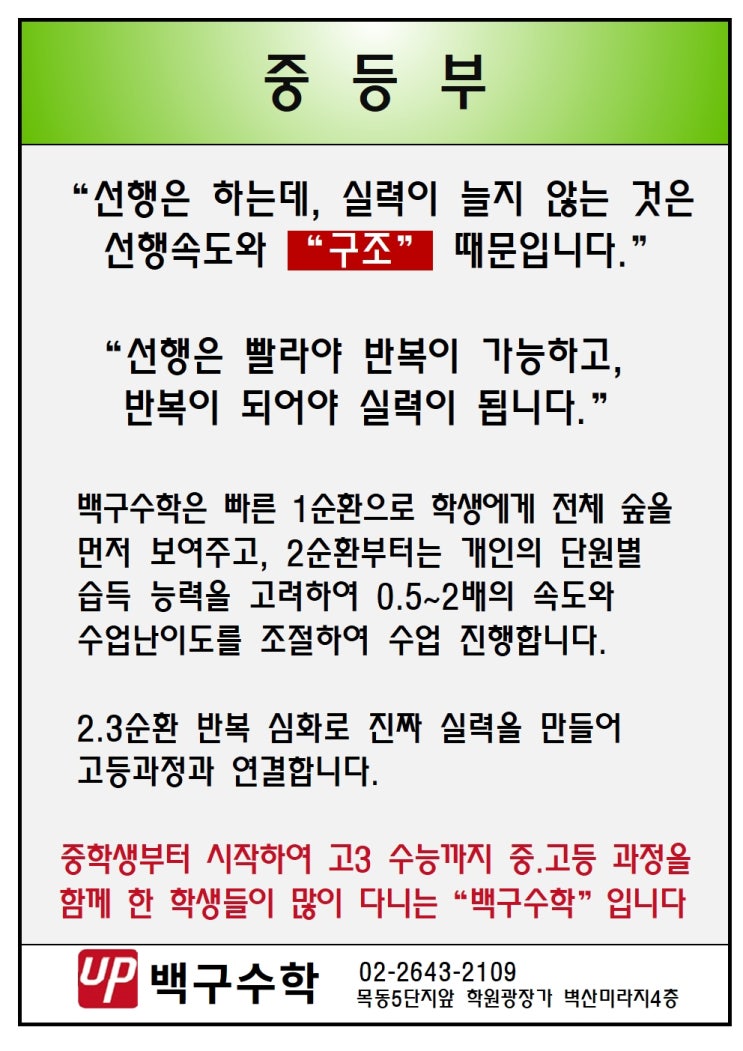3월 9일, 중3 새학기 반이 개강합니다. 중3은 내신과 고등 준비의 갈림길입니다. 문법·독해·구문·데일리 테스트까지 체계적으로 관리하고, 월 1회 모의고사로 실력을 점검합니다. 주 2회 4:45 or 7:00 ~ (요일 및 시간은 레벨별로 다르니 문의 바랍니다.) 2월에 개강한 최상위 Master 주 1회반도 소개합니다. 고등 문법과 고난도 수능 독해를 완성하는 심화 트랙이며, 주 1회 집중 수업으로 효율은 높이고 부담은 줄입니다. 입학 테스트 후 Master반 배정시 입학 가능합니다. 매주 수요일 5:30–10:00 입학 테스트 및 문의 전화: 02-2653-0771 <img src="https://blogthumb.pstatic.net/MjAyNjAyMjNfNjMg/MDAxNzcxODUwMjY0ODAx.OI5_vDQPdVYB8ekde_cbl1eGa56Rg-rw7b3ShaPDL-og.K9wYxN6mT4ctDK5fvxV1bQ-VCWl0mkCg4EH1QRRTMqog.PNG/3%B0%FC%29_%C1%D61%C8%B8%B9%DD.png?type=s3" />