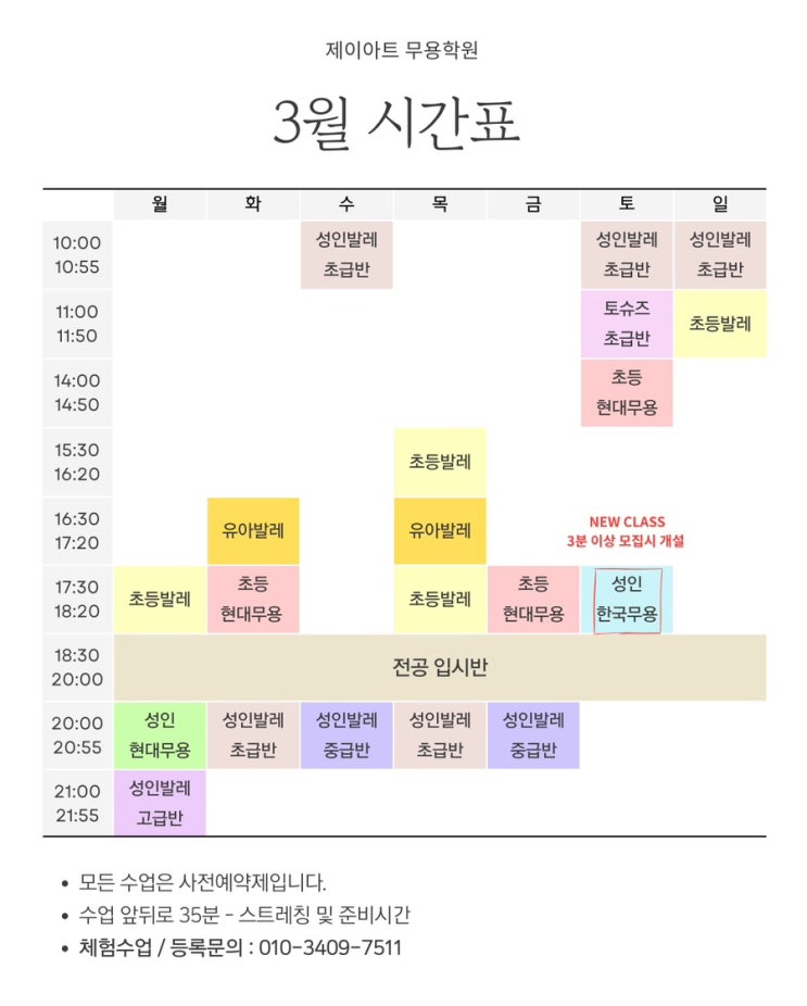 목동 제이아트무용학원 3월 시간표 안내